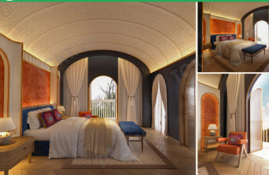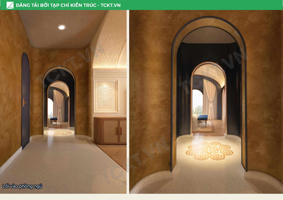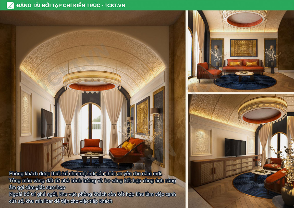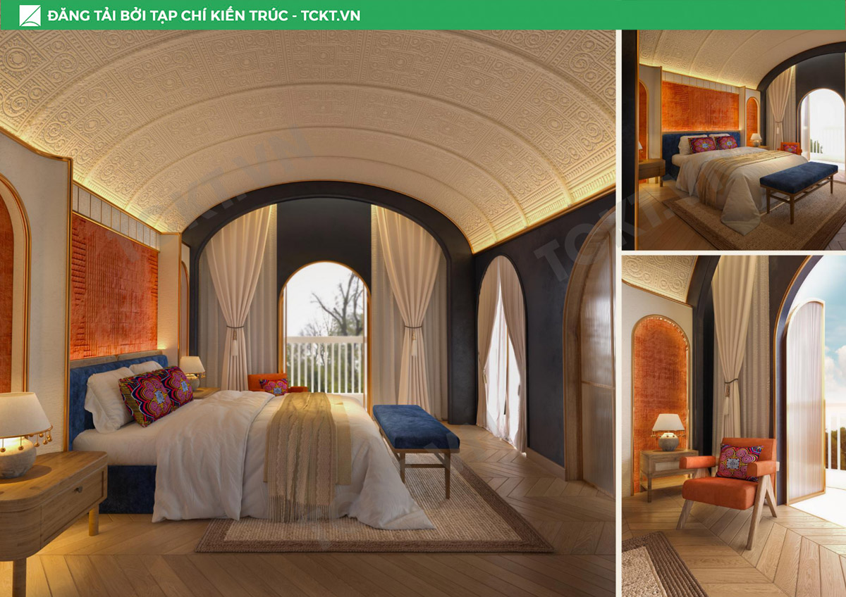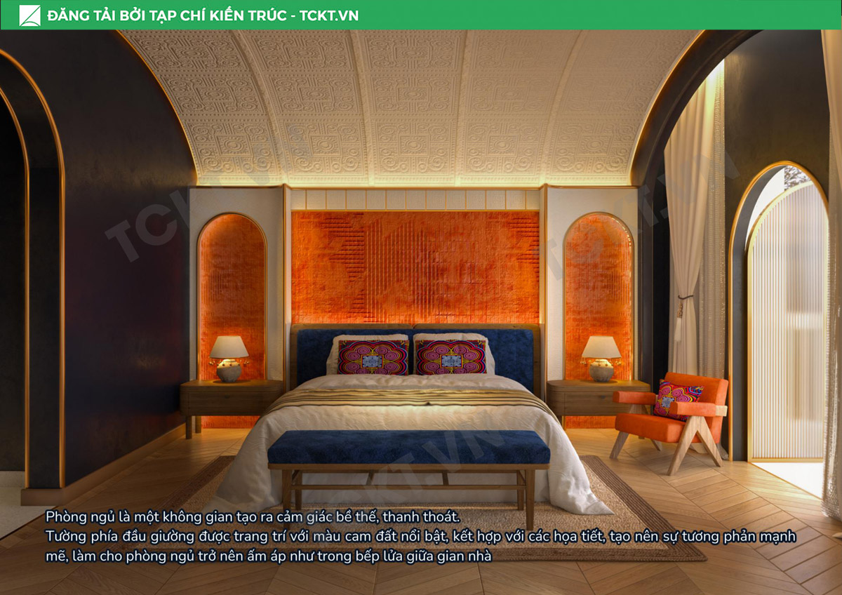 Phòng ngủ “Lời nguyện bình an” (80m²): Không gian lấy cảm hứng từ thời điểm khép lại mùa lễ hội trong sự tĩnh lặng và linh thiêng, gửi gắm lời cảm tạ và cầu chúc an lành. Tông vàng đất và cam đất gợi hơi ấm bếp lửa, hướng đến sự sum họp và bình yên.