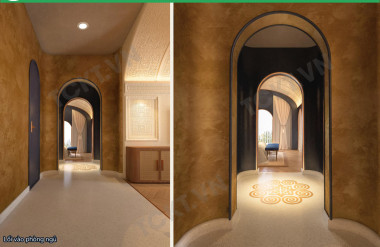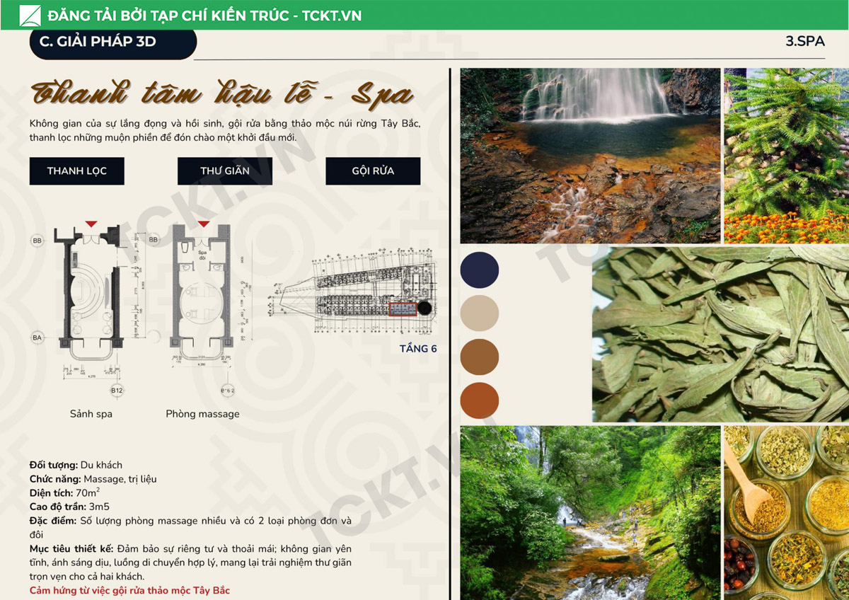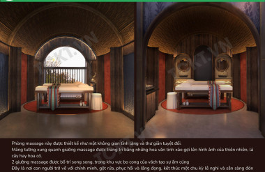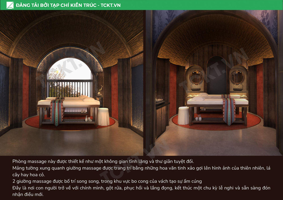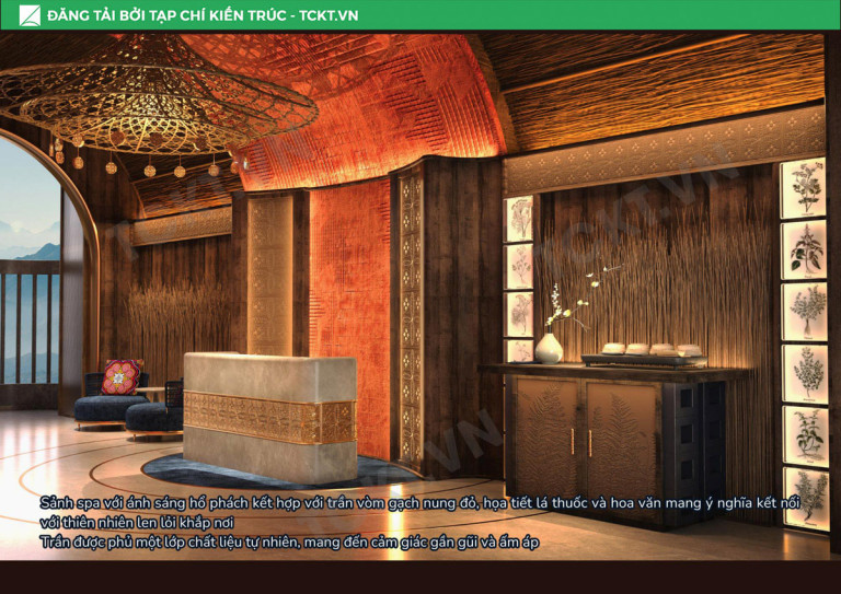 Spa “Thanh tâm hậu lễ” (70m²): Kết thúc chuỗi trải nghiệm bằng việc gội rửa và tĩnh tâm. Ánh sáng hổ phách và hoa văn lá thuốc mang lại cảm giác thanh lọc, hồi sinh, giúp con người trở về với chính mình.