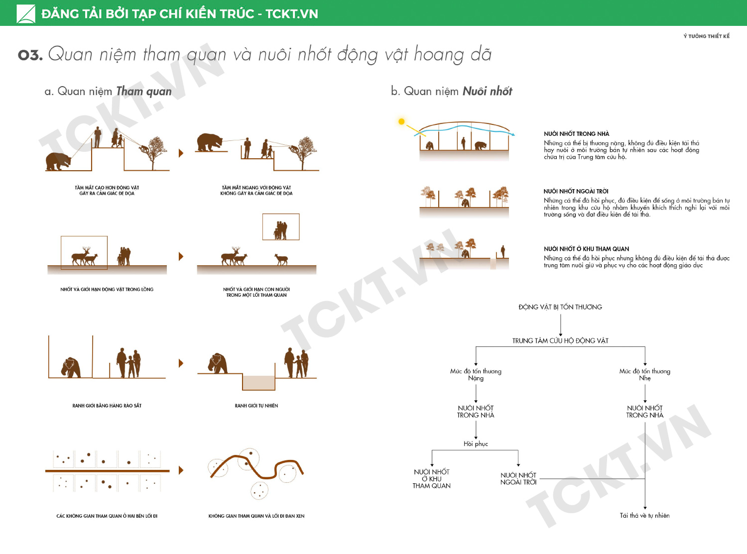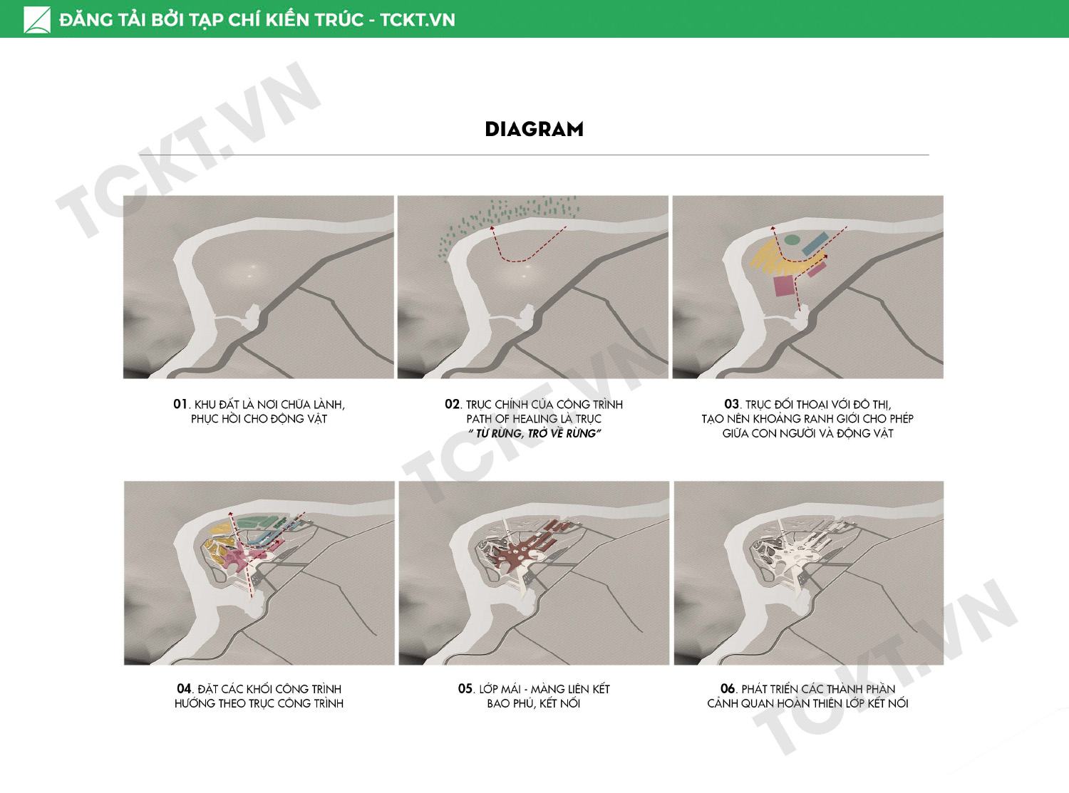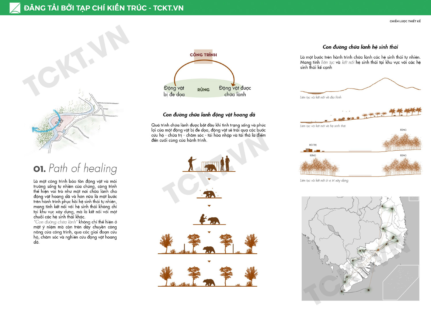 Lấy cảm hứng từ vị trí như một phần tách rời từ rừng, hướng về rừng, công trình chọn con đường “Từ rừng, trở về rừng” đi xuyên suốt theo hành trình chữa lành động vật hoang dã. Các loài động vật sau khi được cứu hộ sẽ trải qua các quá trình chữa trị, chăm sóc, kiểm tra, tái hòa nhập tại công trình và điểm đến cuối cùng là thả chúng về lại môi trường sinh sống tự nhiên. Trên con đường này, con người được mời gọi tham gia để tìm hiểu, nhận biết được giá trị của việc bảo tồn động vật hoang dã cùng với môi trường sống của chúng.