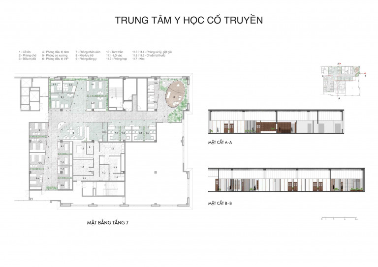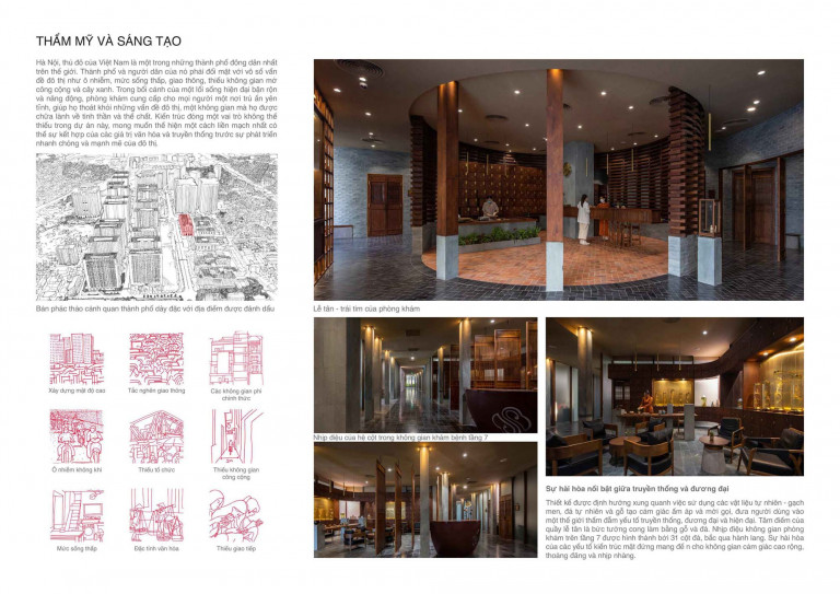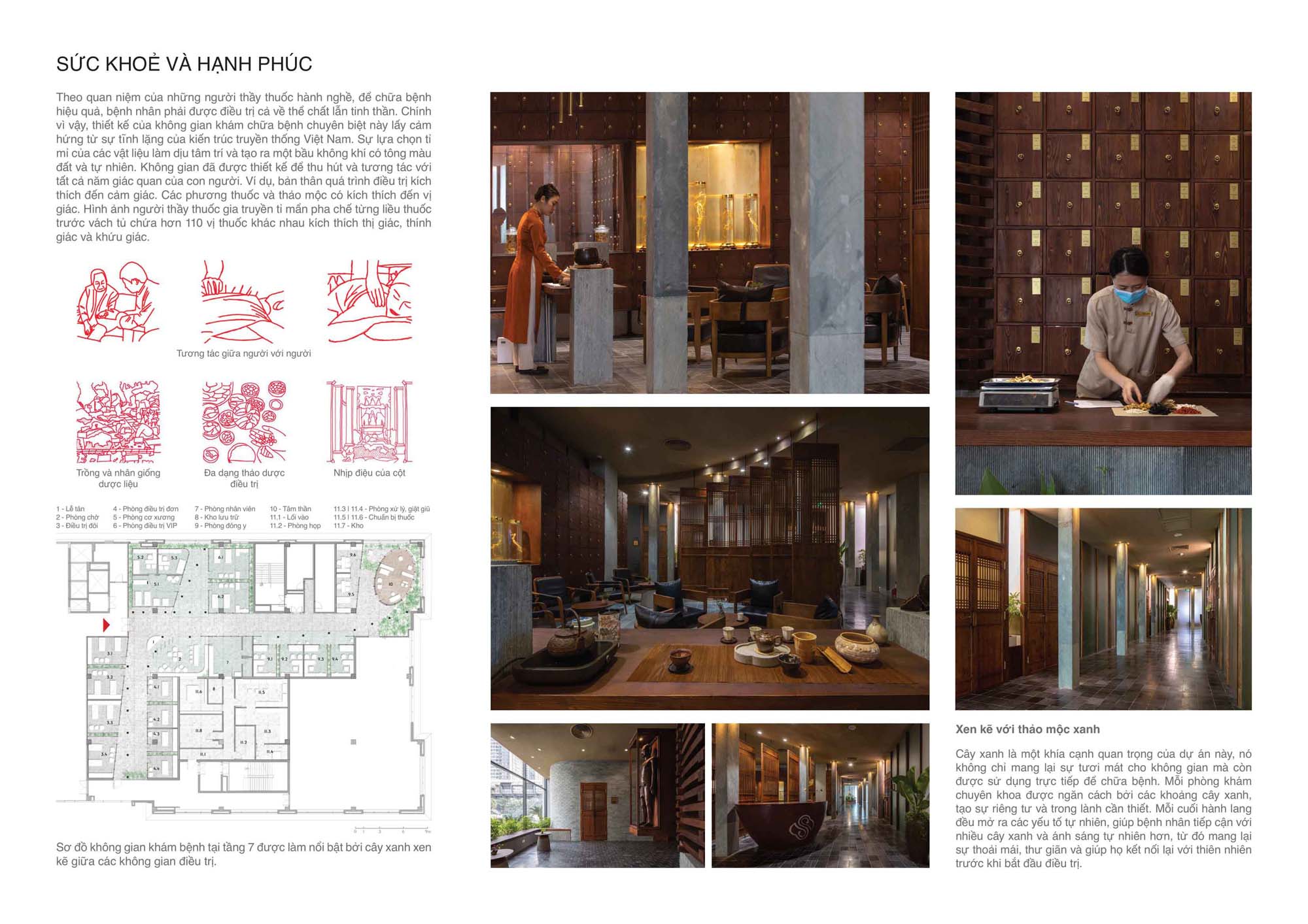 Cũng theo quan niệm của YHCT, việc điều trị cho người bệnh có hiệu quả thì cần phải giải quyết cả hai yếu tố đó là bệnh lý, và tâm lý của người bệnh. Không gian phòng khám chuyên khoa (tầng 07) được thiết kế lấy cảm hứng từ những không gian mang lại cảm giác yên bình trong kiến trúc cổ truyền Việt Nam.