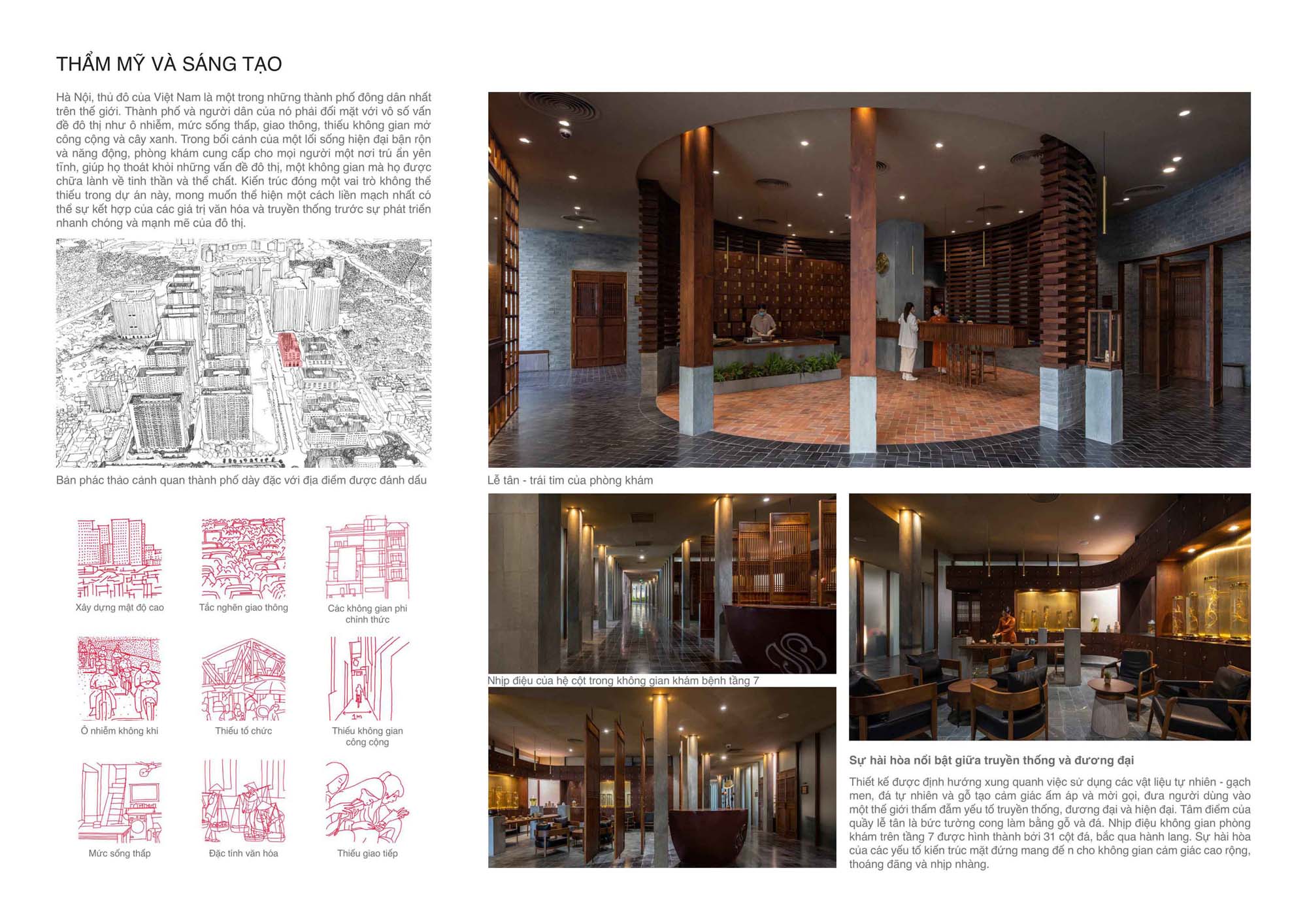 Không gian tiếp đón nằm bên cạnh khu vực sảnh chính của toà nhà, tiếp giáp với trục giao thông lớn tại khu đô thị. Định hướng của thiết kế lấy cảm hứng từ những quan niệm cơ bản của YHCT. Các vật liệu tự nhiên, truyền thống như gạch gốm, đá tự nhiên, gỗ… được kết hợp nhằm mang lại cảm mộc mạc, thân thiện, ấm áp. Một không gian mang đậm tính truyền thống lồng ghép trong bối cảnh không gian chung mang tính thời đại. Đã góp phần xoá nhoà cảm giác công nghiệp, và tạo cho không gian tiếp đón sự ấn tượng, mời gọi con người khám phá và trải nghiệm.