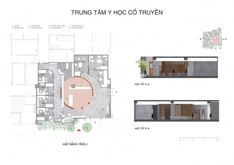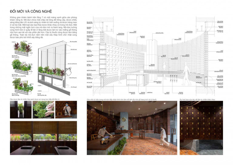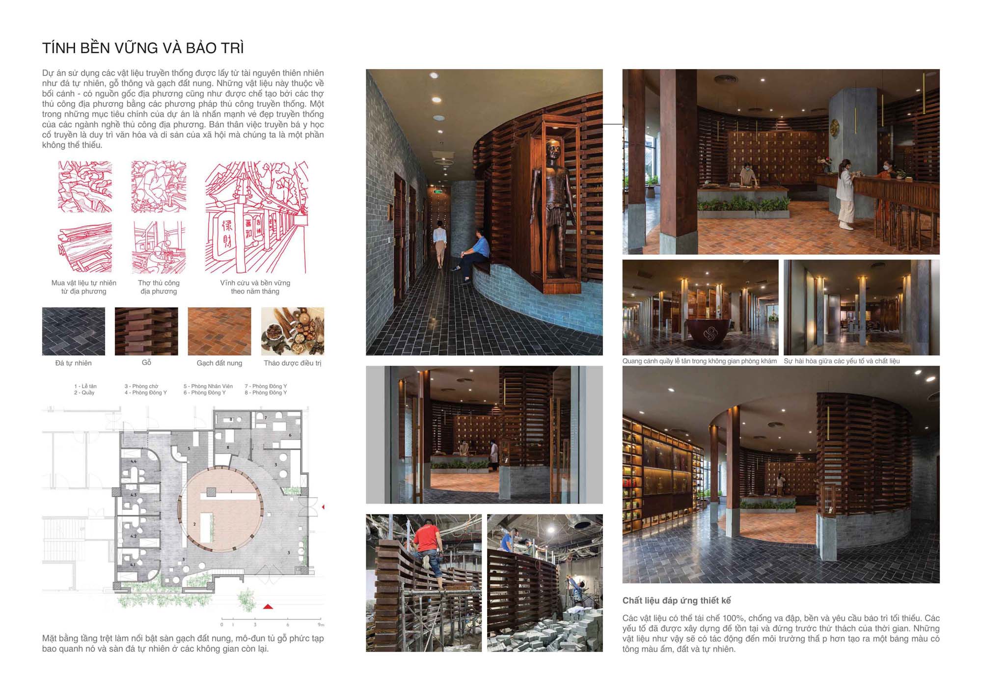 Điểm nhấn trong không gian này là bức tường cong bằng chất liệu đá và gỗ được xây dựng theo phương pháp thủ công truyền thống. Đường cong uyển chuyển ngoài việc nhằm phân định rõ các khối chức năng, còn làm nhấn mạnh hình ảnh người thầy thuốc phối trộn tỉ mỉ, chuẩn xác các vị thuốc bên cạnh tủ thuốc với hơn 110 loại thảo mộc khác nhau đã thể hiện rõ tính đặc trưng của YHCT.