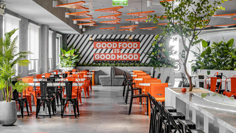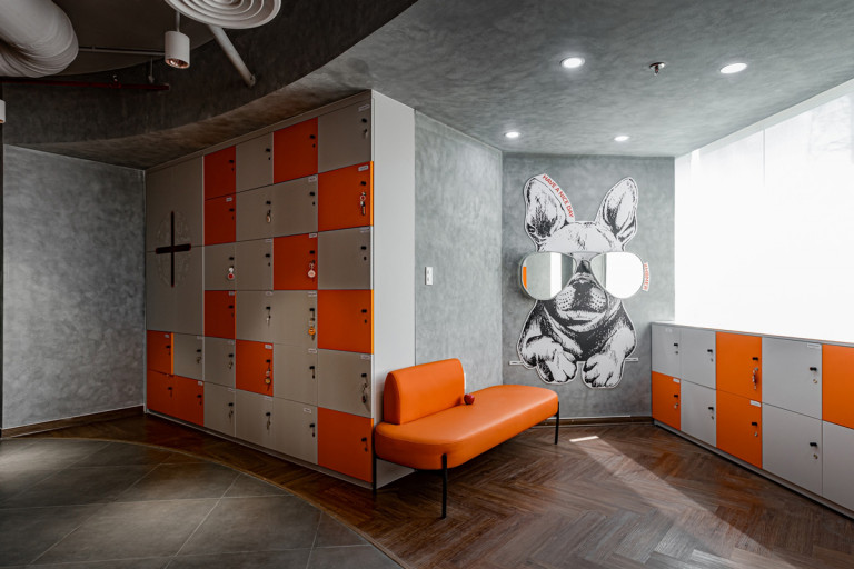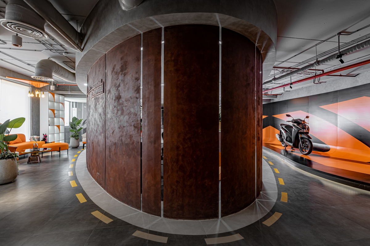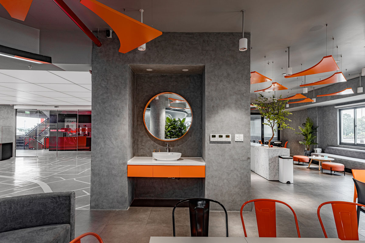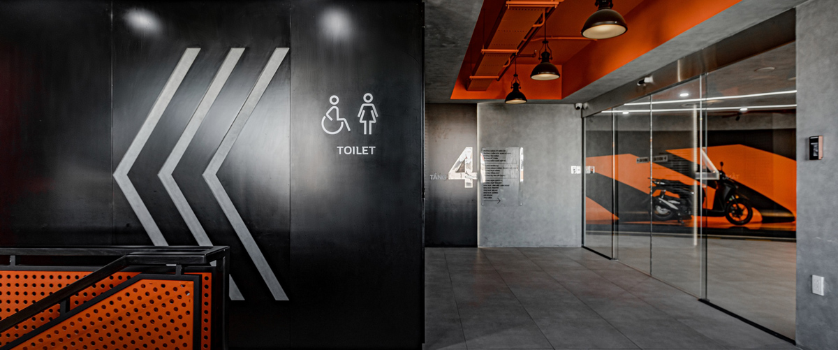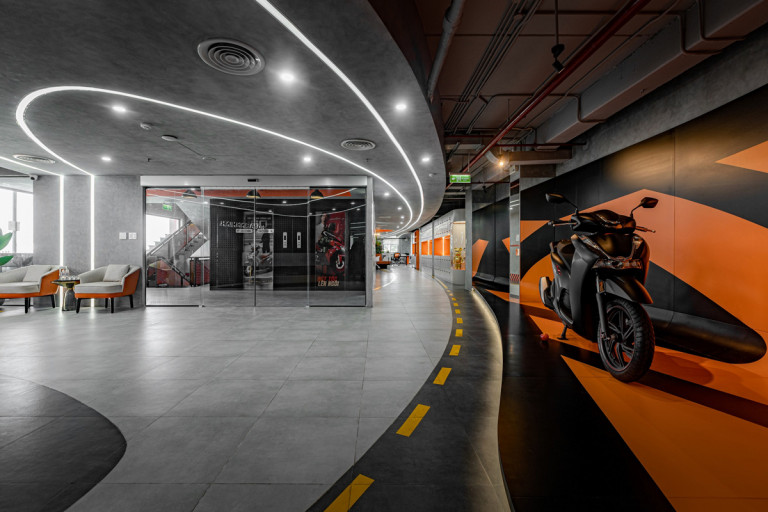 Bên cạnh cặp màu tương phản cam – đen chủ đạo được khai thác từ màu nhận diện của thương hiệu thì còn có sự bổ trợ từ các gam màu trung tính như trắng, xám giúp làm dịu lại, tạo chiều sâu và phân lớp rõ ràng trong không gian.
