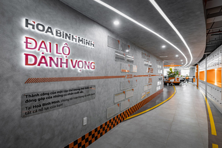 Tinh thần “passion in action” – năng động, mạnh mẽ và quyết liệt được đội ngũ thiết kế thể hiện từ concept hiện đại, màu sắc cá tính và các chi tiết EGD (thiết kế đồ họa môi trường) độc đáo xuyên suốt trong không gian văn phòng của Hòa Bình Minh.