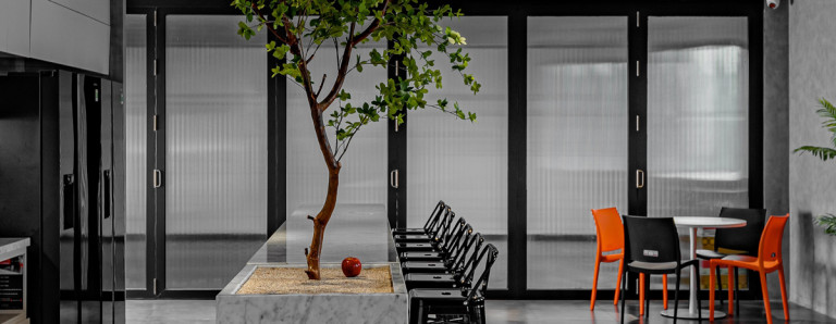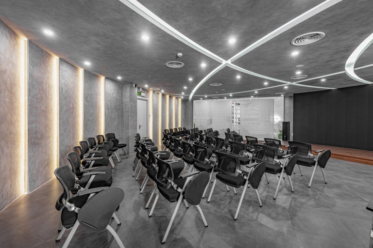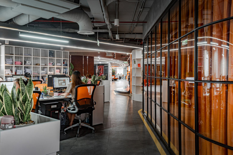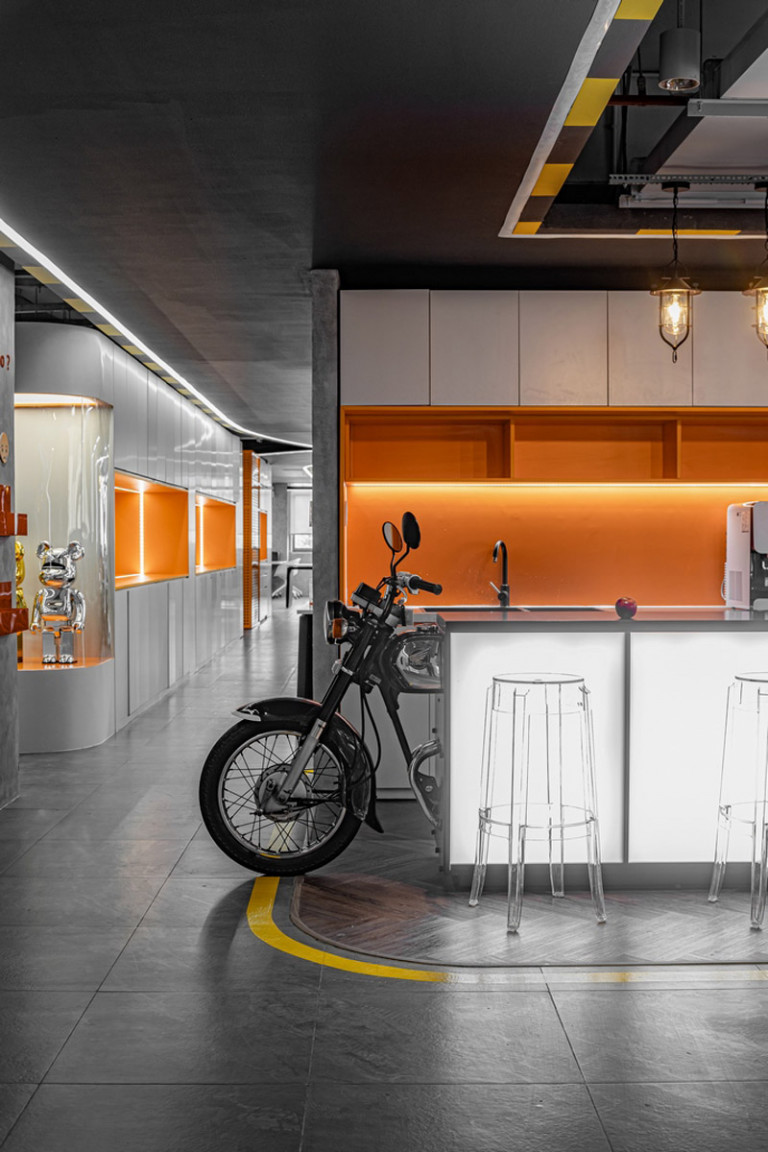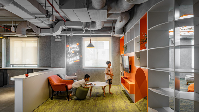 Nội thất đơn giản, hiện đại kết hợp cùng màu sắc đen – cam tạo điểm nhấn cũng như giúp không gian trở lên tươi sáng thoải mái, kích thích sự sáng tạo.