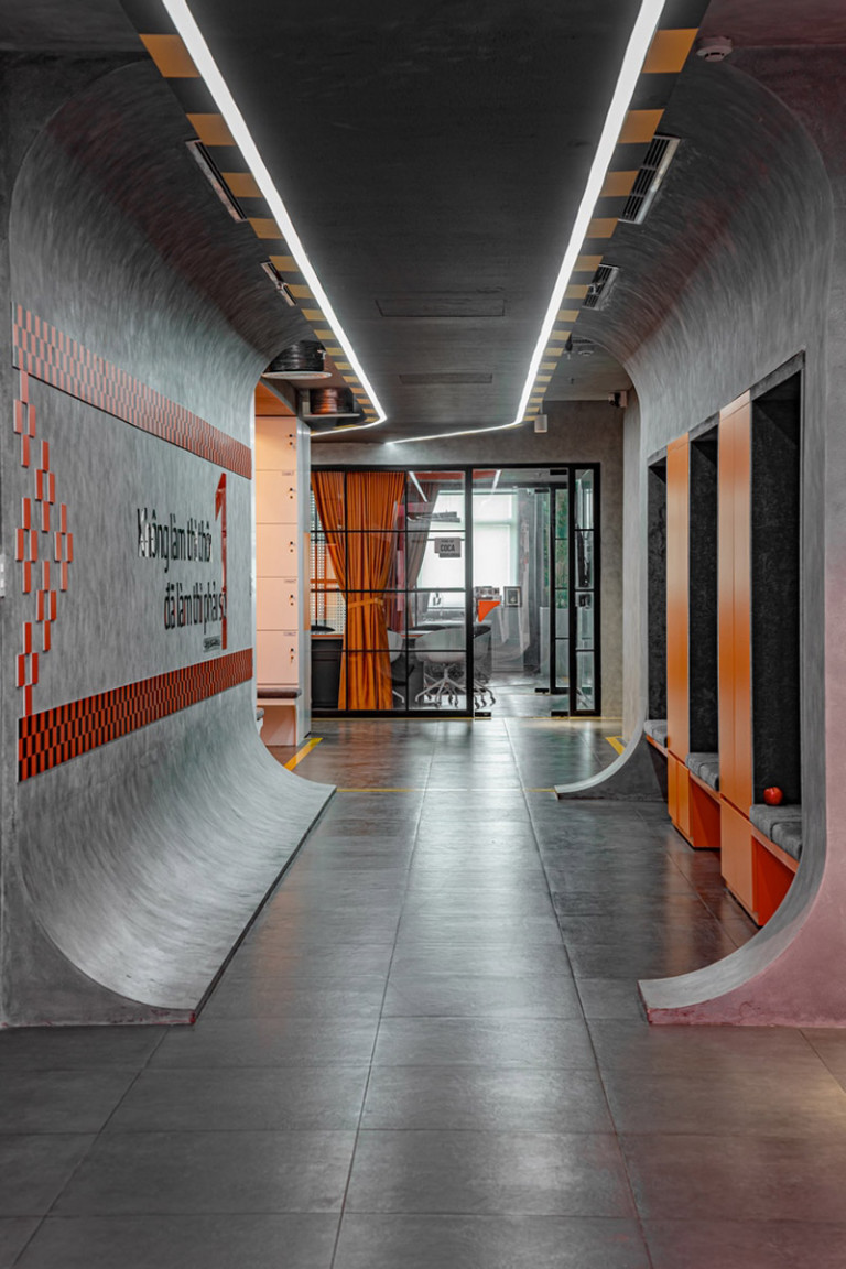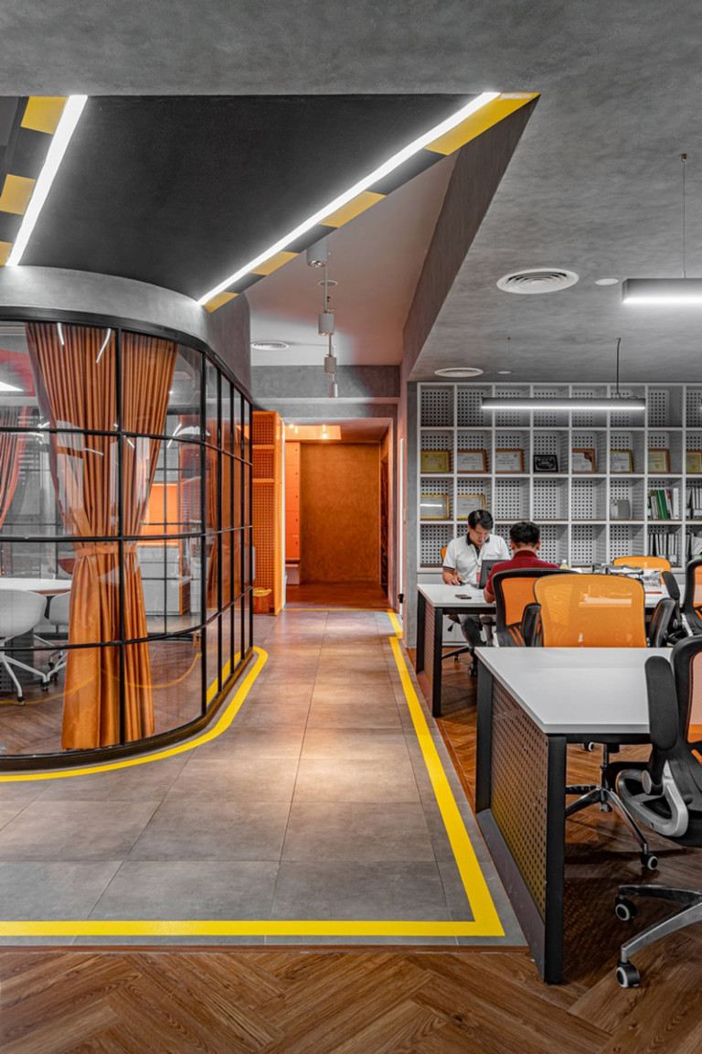 Bước vào văn phòng là hình ảnh con đường upside down được khai thác cả trên hệ trần và sàn. Các tấm dán decal dải phân cách dọc theo hành lang tạo cảm giác về sự chuyển động, đồng thời cũng là yếu tố điều hướng, dẫn dắt người dùng di chuyển qua các không gian.