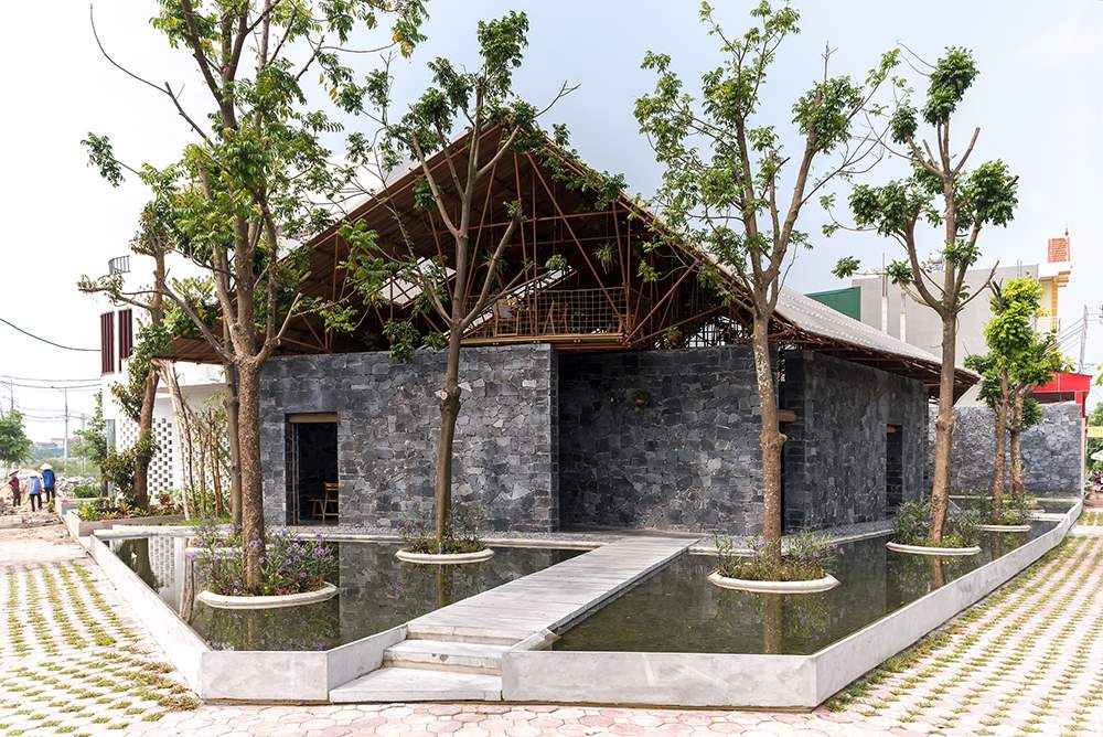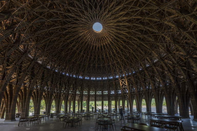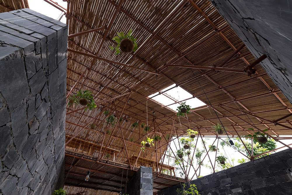 Công trình có diện tích bằng mái là 1051 m2, với bán kính mái lớn nhất là 18.3 m, chiều cao tới đỉnh mái là 15.85 m, ghi mốc công trình cao nhất trong chuỗi thiết kế nhà tre của VTN Architects. Cấu trúc tre gồm 36 khung tre tạo nên hình thức mái vòm 3 tầng mái được lấy cảm hứng từ kiến trúc truyền thống.