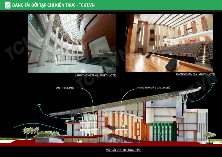Phòng khán giả 700 chỗ bố trí tại trung tâm Nhà văn hóa kết nối khu sảnh thông tầng lên tới mái đảm bảo cho các hoạt động công cộng như triển lãm ảnh, triển lãm tranh,… Phòng khán giả được thiết kế 2 tầng có sức chứa 700 người được lấy ý tưởng nội thất cách điệu từ những phím đàn piano kết hợp hệ thống dải đèn Led như một dòng nước chảy xuống từ trên cao tạo ra một không gian đẹp, lãng mạn và độc đáo.