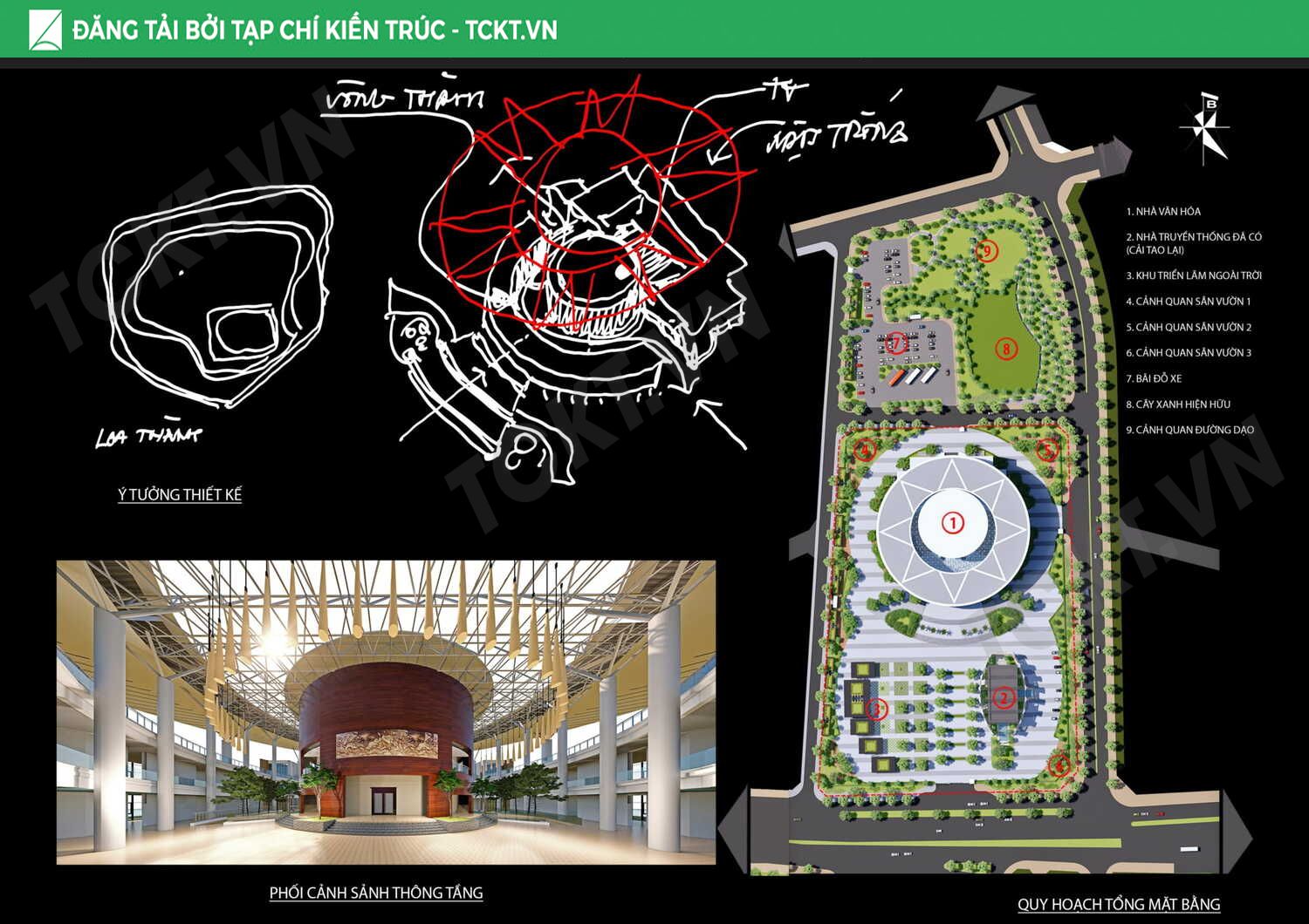 Trên tổng mặt bằng công trình có nhà truyền thống đã được xây dựng từ những năm 90 mang tính chất lịch sử, giải pháp kiến trúc đưa ra là cải tạo một phần vỏ bao che cách điệu mai rùa lấy ý tưởng từ thần Kim Quy trong truyền thuyết tạo nên một tổng thể kiến trúc độc đáo không thể trộn lẫn rất phù hợp ý tưởng kiến trúc Loa Thành và phù hợp với kiến trúc Nhà văn hóa.