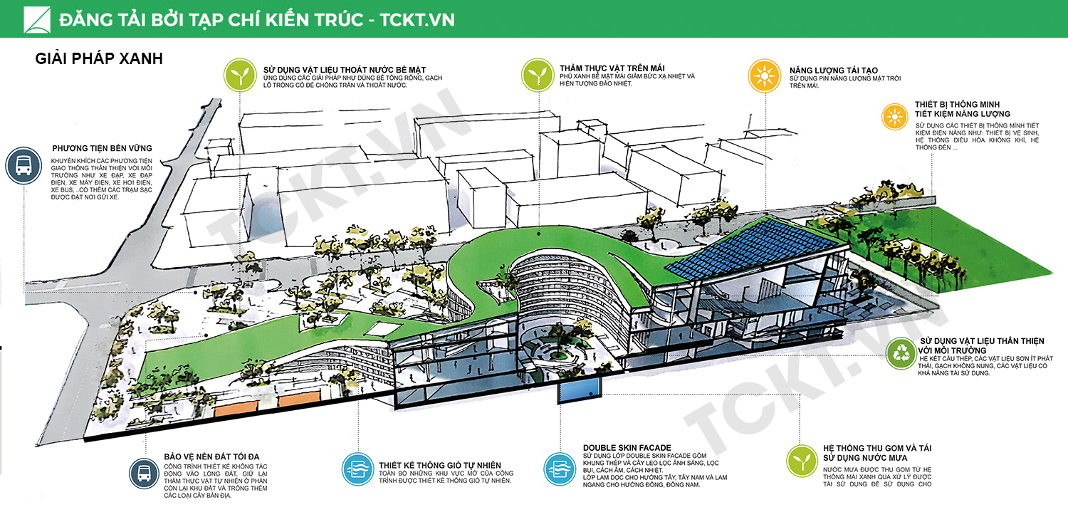“The Green wave” được tạo nên từ những đường nét hiện đại với hình khối uốn lượn liên tục, hài hòa, Hình dáng dài và mỏng “ôm” lấy các không gian sinh hoạt chung, không những tối ưu hoá khả năng sử dụng, tăng cường sự tương tác giữa các không gian mà còn tận dụng được các yếu tố về sinh khí hậu như chiếu sáng, thông gió và bóng đổ. “The green wave” như một “làn sóng xanh” kết nối mảng xanh của thành phố tạo nên trục xanh liên hoàn xuyên suốt quận trung tâm, từ công viên Tao Đàn, Dinh Độc Lập đến công viên 30/04, Thảo cầm Viên, tạo được không gian cây xanh với các giải pháp thiết kế tiết kiệm năng lượng, thân thiện môi trường, giảm ô nhiễm và ổn định hệ sinh thái đô thị. Hơn nữa, có thể xem đây là một “làn sóng” về công trình xanh, lối sống xanh, truyền tải những thông điệp về môi trường và sự phát triển bền vững cho cộng đồng thông qua những trải nghiệm về những lợi ích mà một công trình xanh mang lại.