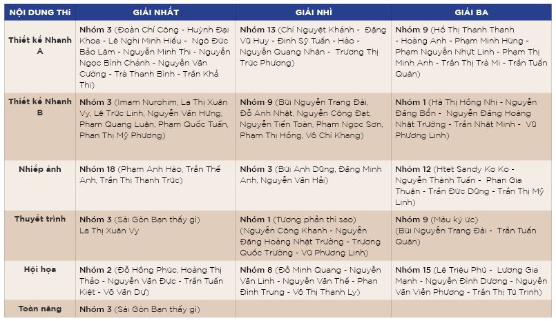 Nhóm SV đạt giải thưởng cao nhất tại Festival 2018 (nhóm 3 với giải thưởng toàn năng) đã thể hiện bản lĩnh làm việc nhóm xuất sắc với sự kết hợp ăn ý của 25 thành viên đến từ 19 trường Kiến trúc khác nhau trong và ngoài nước. Điều dễ nhận thấy là nhóm các em đã biết cách phát huy tối đa năng lực sáng tạo, cá tính của mỗi cá nhân để làm nên một đồ án tập thể đầy đặn. Đồ án với chủ đề “Sài Gòn Bạn thấy gì” này có chiều sâu trong phân tích hiện trạng và xây dựng định hướng bảo tồn- phát triển không gian đô thị khu vực chợ Bến Thành, ký họa tốt, thể hiện tốt, chuyển tải tốt ý tưởng thiết kế thành một thông điệp nhất quán.