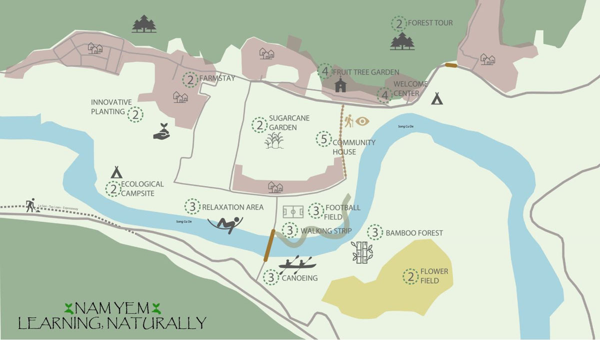 - Một trong những ý tưởng của Khóa học mùa hè là đề xuất việc hình thành “Làng du lịch học tập” tại các vùng cảnh quan trên thông qua các hoạt động học hỏi, tìm hiểu thiên nhiên, nơi có nhiều đặc điểm văn hóa thế mạnh cần được duy trì và sử dụng để thu hút du lịch đến khu vực. Đồng thời, nghiên cứu cũng chỉ ra nhu cầu hình thành các trung tâm tiếp đón du khách do người dân địa phương quản lý, có đầy đủ cơ sở hạ tầng cơ bản như nhà vệ sinh, internet, và cung cấp các thông tin du lịch cơ bản. Trong bối cảnh hợp tác với UBND và Hội Phụ nữ xã Hòa Bắc, Quỹ Môi trường toàn cầu Liên hiệp quốc (GEF), các tài trợ nhỏ của Trung tâm Nghiên cứu Phát triển Bền vững (CSDS) và Quỹ viện trợ Ireland (IrishAid), chuỗi Workshop nghiên cứu không gian kiến trúc, cảnh quan và thiết kế nhận diện thương hiệu cho các trung tâm tiếp đón du khách tại địa phương được thực hiện tại homestay Alang Như (thôn Giàn Bí) và homestay Nam Yên (Thôn Nam Yên). Với sự tham gia của ĐH Kiến trúc Đà Nẵng (3 chuyên ngành gồm Đồ họa, Kiến trúc và Du lịch) và Khoa Địa lý, ĐH Sư phạm, ĐH Đà Nẵng (chuyên ngành Địa lý, Môi trường), các workshop tập trung vào các thiết kế nội thất, cảnh quan sân vườn và các sản phẩm nhận diện thương hiệu cho homestay dựa vào những dữ liệu về giá trị văn hóa, lịch sử, kiến trúc cảnh quan đặc trưng của người đồng bào Cơ Tu.