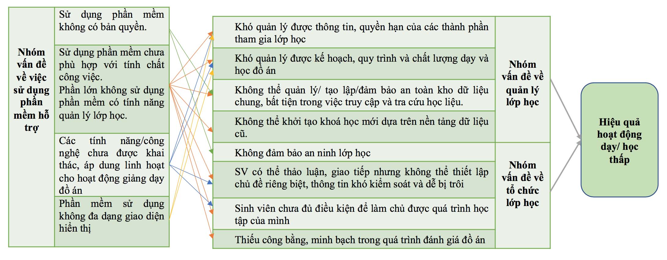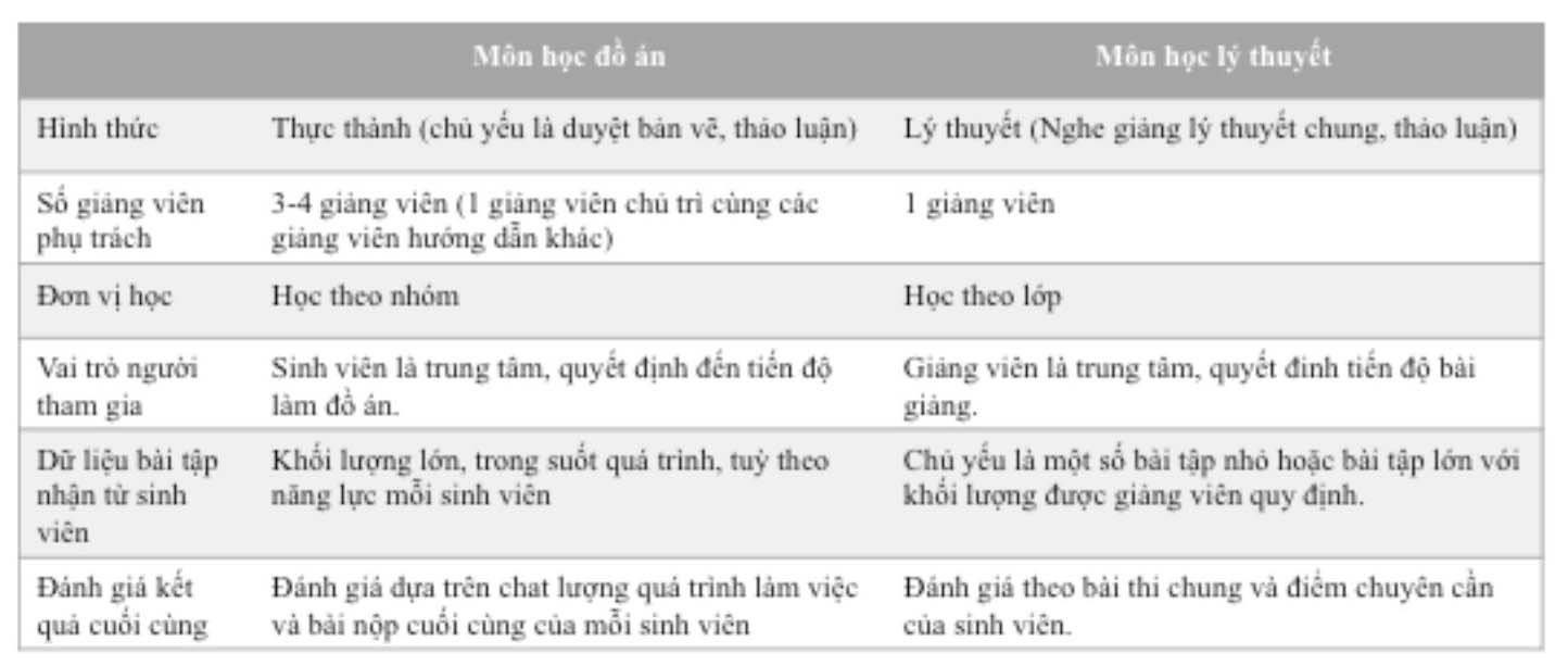 Đồ án thiết kế là một môn học với những đặc trưng về: Hình thức, số lượng GV phụ trách, dữ liệu bài tập (chủ yếu là hình vẽ), cách thức đánh giá (Bảng 1) khi sử dụng hệ thống quản lý và tổ chức giảng dạy chung của nhà trường đã lộ rõ nhiều bất cập. GV chưa ứng dụng linh hoạt được các phần mềm khác để hỗ trợ hoặc thay thế phần mềm của nhà trường khi phần mềm này thiếu tính năng hoặc có sự cố. Bằng phương pháp khảo sát qua bảng hỏi kết hợp với phương pháp phỏng vấn sâu đối với GV và SV (cũng bằng hình thức trực tuyến), kết quả khảo sát cho thấy các vấn đề cụ thể trong giảng dạy trực tuyến môn học đồ án hiện nay như sau: