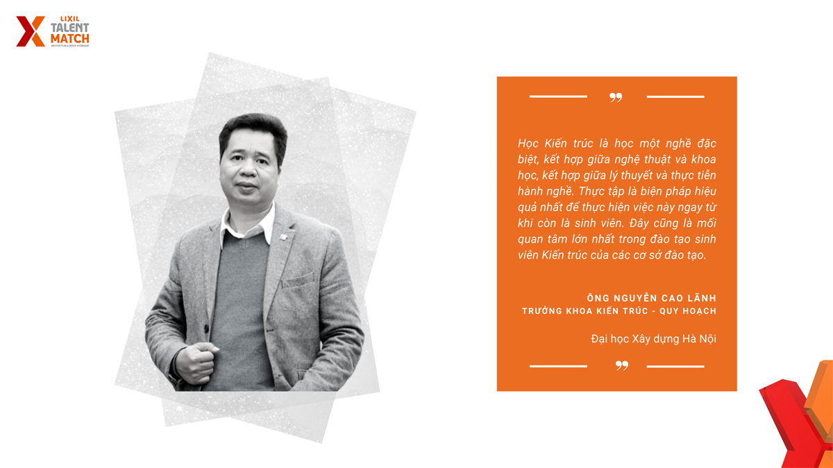 “Học Kiến trúc là học một nghề đặc biệt, kết hợp giữa nghệ thuật và khoa học, kết hợp giữa lý thuyết và thực tiễn hành nghề. Thực tập là biện pháp hiệu quả nhất để thực hiện việc này ngay từ khi còn là sinh viên. Đây cũng là mối quan tâm lớn nhất trong đào tạo sinh viên Kiến trúc của các cơ sở đào tạo.” Ông Nguyễn Cao Lãnh bày tỏ.