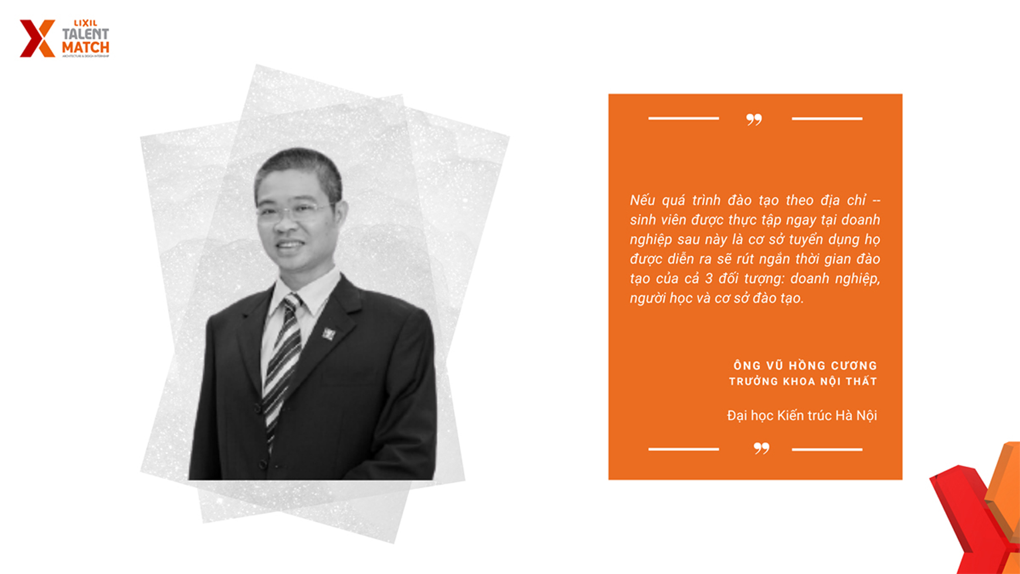 Theo Ông Vũ Hồng Cương – Trưởng khoa Nội thất Đại học Kiến trúc Hà Nội, tham dự chương trình, sinh viên được “hưởng lợi” thông qua lộ trình đào tạo theo địa chỉ – sinh viên được thực tập ngay tại doanh nghiệp sau này là cơ sở tuyển dụng họ. Quá trình này sẽ rút ngắn thời gian đào tạo của cả 3 đối tượng: doanh nghiệp, người học và cơ sở đào tạo. Bên cạnh đó, sinh viên không những được học nghề mà còn được truyền lửa đam mê kiến trúc từ chính người dẫn dắt – thế hệ Kiến trúc sư đi trước đầy tâm huyết với nghề.