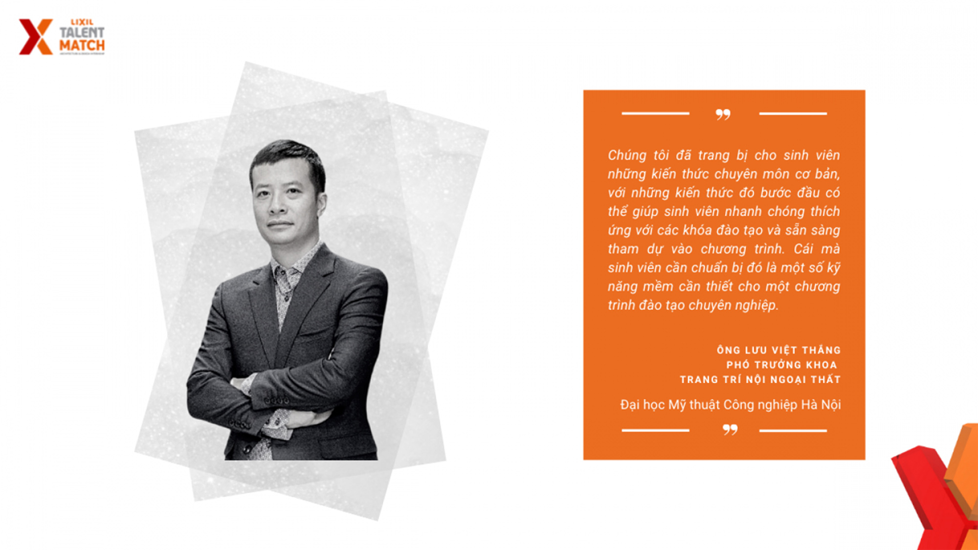 “LIXIL Talent Match hướng tới việc tạo môi trường nhằm ươm mầm và phát triển tài năng cho các bạn sinh viên Kiến trúc – Thiết kế. Để làm được điều đó, thì ngoài việc kết hợp cùng nhà trường cùng thiết kế những chương trình đào tạo bài bản chuyên sâu về ngành nghề, kết hợp cùng các văn phòng kiến trúc để tạo môi trường thực hành chuyên nghiệp, chương trình cũng sẽ hướng tới những đào tạo toàn diện nhằm cung cấp cho các bạn thêm các kỹ năng mềm, cũng như có sự đồng hành mang tính cá nhân hóa để phù hợp với từng bạn từ những chuyên gia của chương trình trong quá trình mentor (dẫn dắt).” Chia sẻ của Ths. Nguyễn Quỳnh – Giám đốc Marketing Dự án và Hình ảnh doanh nghiệp, Công ty LIXIL Việt Nam.