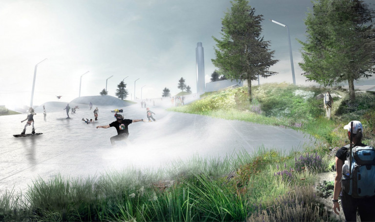 Bjarke Ingels’ firm BIG is behind the new power plant, which is already in operation in the Danish capital. The firm asked SLA Architects to design the large park that will cover the roof, featuring hiking trails, climbing walls, viewpoints and a 600-metre-long ski slope.