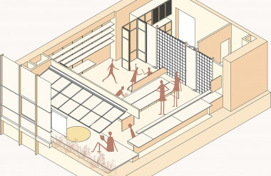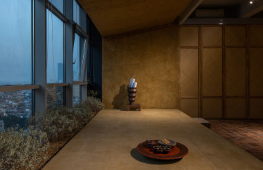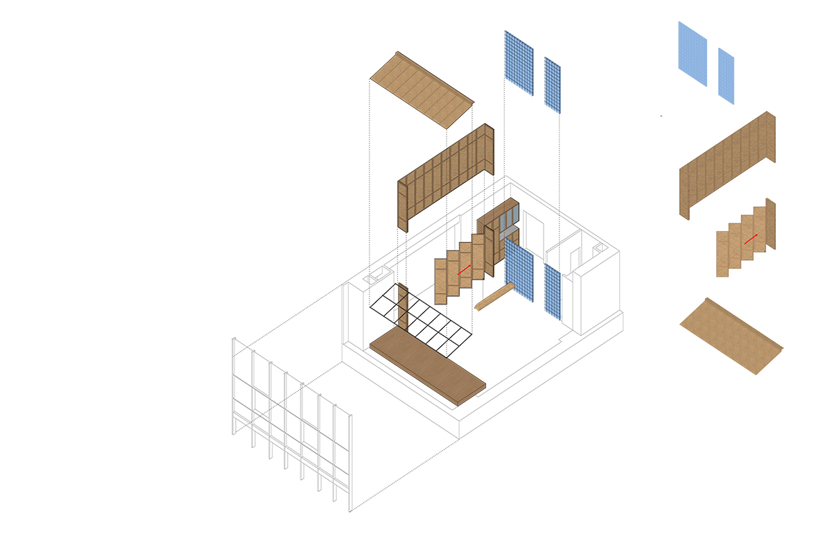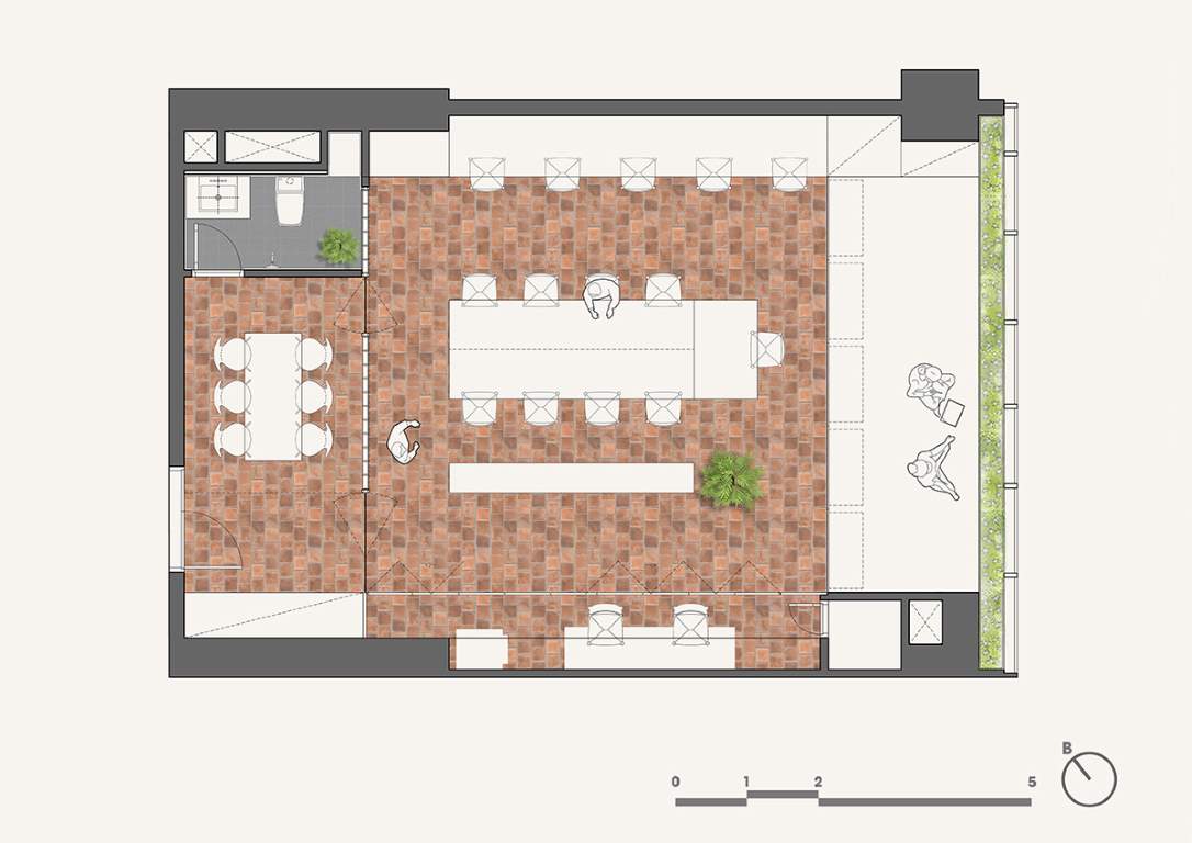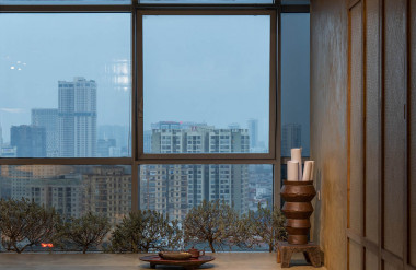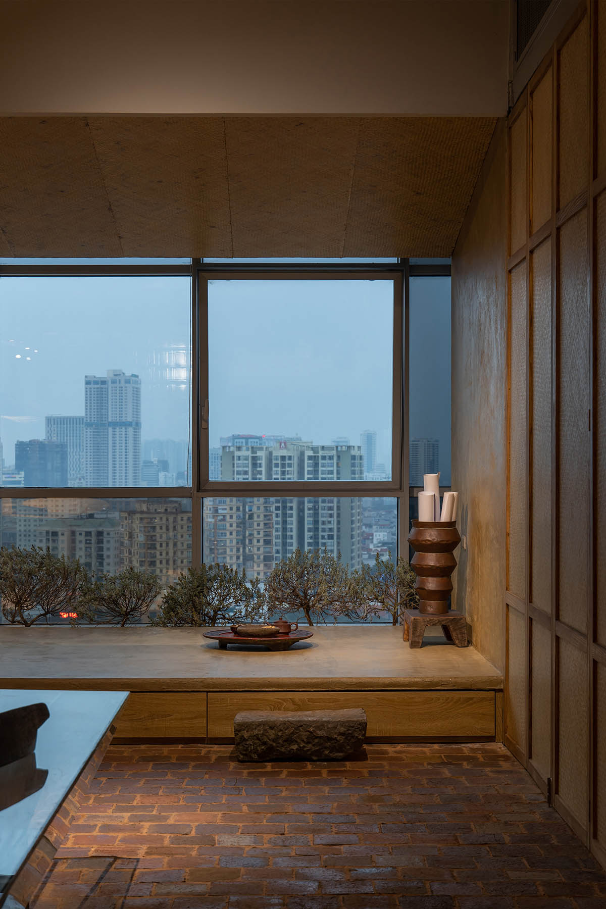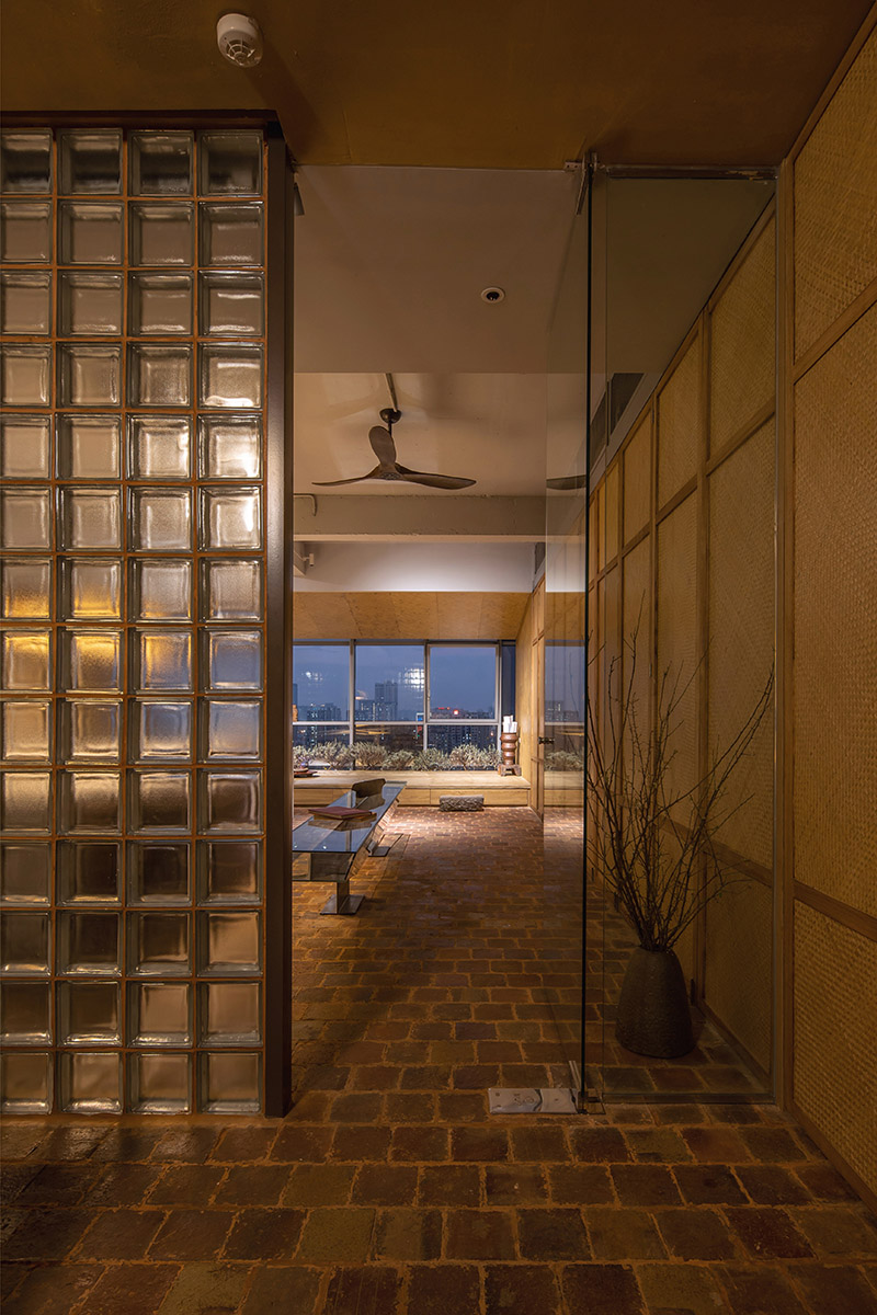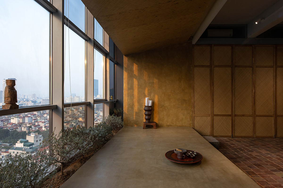 Xuất phát từ khả năng cản nắng và dễ đón gió từ mái nhà truyền thống, chúng tôi thiết kế một hệ mái dốc tại không gian giáp cửa sổ đồng thời nâng cote nền, vừa là không gian thở để nghỉ ngơi, thư giãn vừa tận dụng ánh sáng để trồng cây nhằm kiến tạo hệ không gian xanh trong lành. Từ đó, nơi đây thực sự trở thành một mái hiên, nơi mà chúng tôi trò chuyện với nhau, nơi để mọi người ngắm nhìn thành phố nhâm nhi tách trà chiều hay đơn giản là cảm nhận thiên nhiên với sự biến đổi của nắng, mưa và gió.