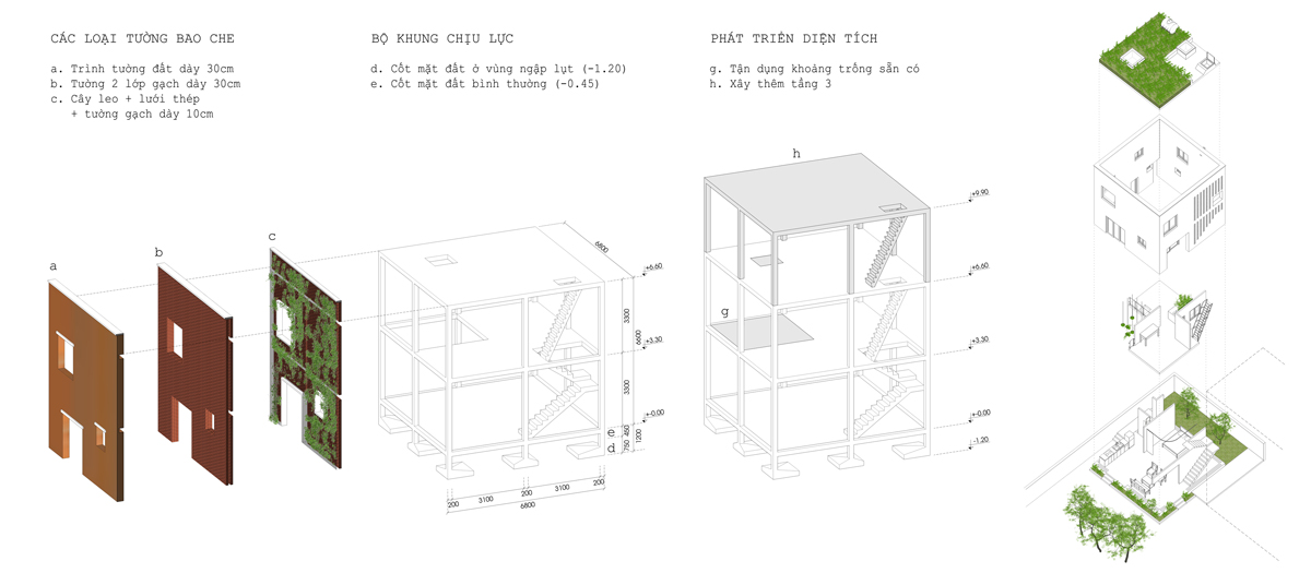 Để module này có thể ứng dụng được rộng rãi và thực sự hiệu quả trong thực tiễn, thiết nghĩ H&P còn phải giải quyết thêm một số vấn đề về kiến trúc. Đó là, giảm thiểu các cửa trời để tối đa hóa diện tích vườn trên mái; làm sao cho các bức tường double skin có thể “thở” được; che nắng và chống mưa hắt vào cửa sổ; nhiệt đới hóa một số chi tiết vàcấu tạo,.. và cho thấy là có khả năng đáp ứng được nhu cầu tổ chức cuộc sống của các gia đình 2-3 thế hệ (mà chắc chắn là phức tạp hơn rất nhiều so với nguyên mẫu). Việc nhân rộng các module điển hình 7m x 7m cũng cần thích ứng tối đa với hiện trạng về sở hữu và sử dụng đất, làm sao vẫn đảm bảo có những khoảng sân của quyền lợi riêng và chia sẻ nhiều không gian cho lợi ích chung. Ở Mạo Khê, H&P đã đề xuất một cụm 3 khối nhà khác nhau cho 3 anh em, nhưng mới chỉ thực hiện được 1/3 (vì 2 người em đã có gia đình và có chỗ ở ổn định nên chưa có nhu cầu xây nhà mới).