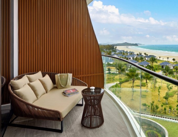 Để giúp khách hàng có trải nghiệm giao hòa không có khoảng cách với thiên nhiên trên ốc đảo này, Khách sạn Angsana đặc biệt sử dụng kính siêu trắng và kính tiết kiệm năng lượng sản xuất nội địa bởi Viglacera cho các hạng mục lan can và cửa kính của tổ hợp.