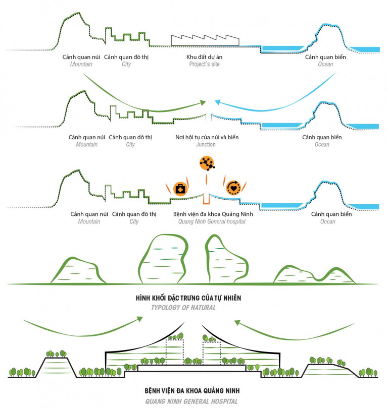 Nhờ việc tận dụng các lợi thế của khu đất, bệnh viện Quảng Ninh sẽ là một tổ hợp độc đáo với ấn tượng của tỉnh nhà mạnh mẽ, là nơi giao hòa giữa thiên nhiên, thành phố và con người.