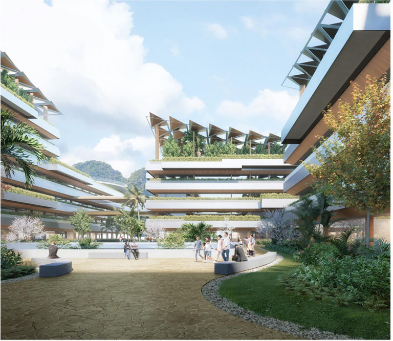 Địa hình Hạ Long là những hòn đảo, núi xen kẽ giữa các trũng biển. Những đảo đá vôi vách đứng với đa dạng hình dáng nhấp nhô trên mặt nước. Dựa trên đặc trưng này của tự nhiên, dự án lấy ý tưởng mặt cắt toàn công trình từ những đường nét uyển chuyển của Hòn Trống Mái và các đồi núi xung quanh trên mặt biển. Tạo ra sự chuyển động liên tục lên xuống của các vùng cảnh quan và các toà nhà.