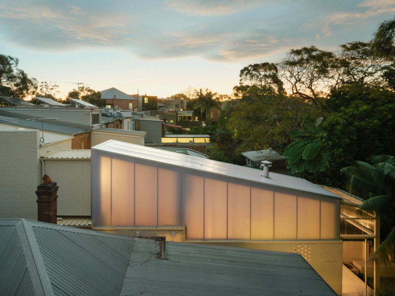 Ngôi nhà khi lên đèn vào buổi tối. Trên tường gạch có sẵn, một khối cấu trúc bằng vật liệu polycarbonate được dựng lên, tạo nên tầng lửng với hai phòng ngủ và một phòng tắm phụ. Lớp vỏ này cho phép ánh sáng tự nhiên khuếch tán xuyên suốt cả ngày. Đồng thời, lớp vật liệu này cũng đóng vai trò như một mái che trong suốt phía trên khoảng thông tầng khu sinh hoạt chung.