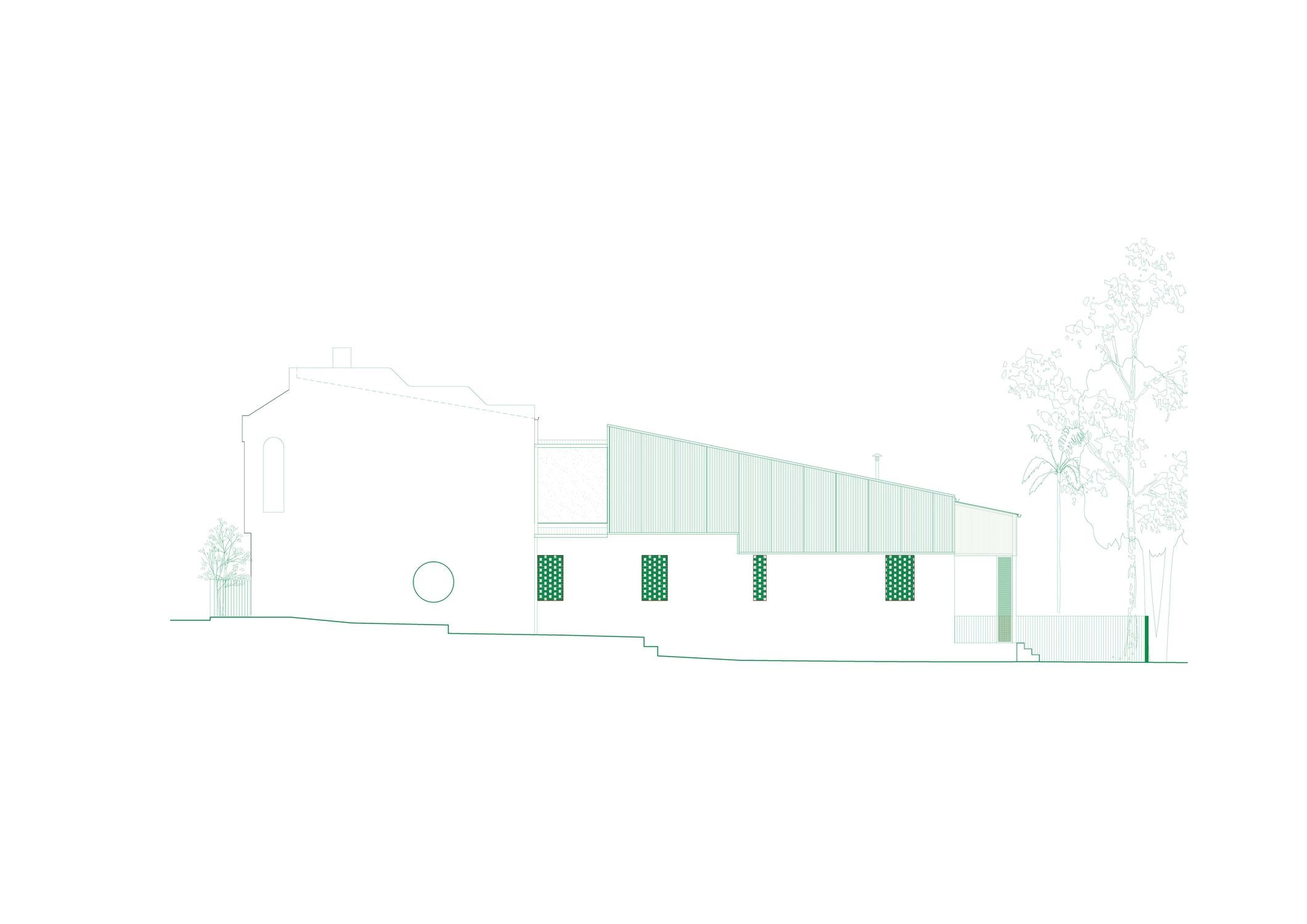 Mặt tiền của căn nhà (bên phải) nhìn ra đường phố. Với diện tích hạn chế 95 m2 và kết cấu tường gạch có sẵn còn khá vững chắc, nhóm thiết kế hạn chế phá dỡ mà tập trung tạo ra những không gian đa năng.