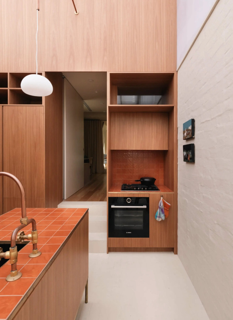 Ở khu vực bếp, bề mặt bàn lát gạch bóng kết hợp cùng các chi tiết màu cam xuyên suốt không gian nội thất. Gỗ được ốp dọc theo bức tường hướng lên khoảng thông tầng.