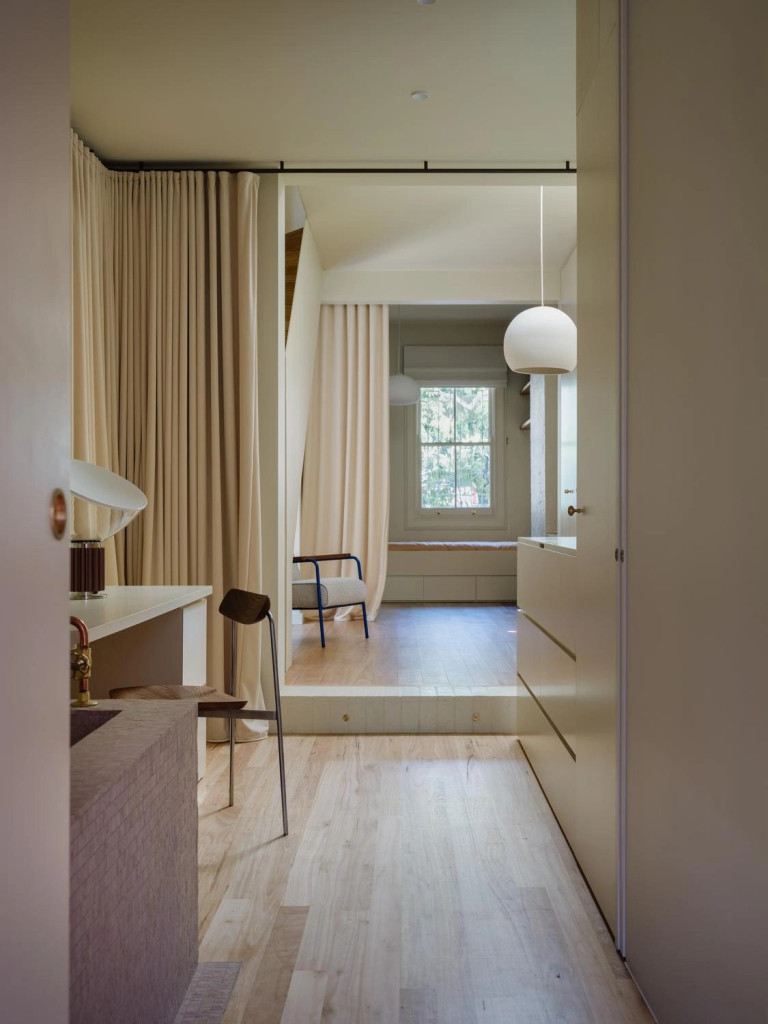 Tiếp đó là phòng làm việc tích hợp giường ngủ và tủ âm tường. Phòng tắm và bồn tắm đặt đối xứng hai bên. Hệ cửa trượt ở phòng tắm cho phép tách khu vực bồn tắm khỏi các không gian còn lại khi cần thiết.