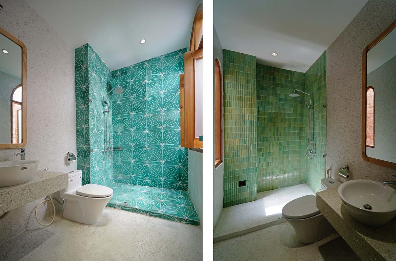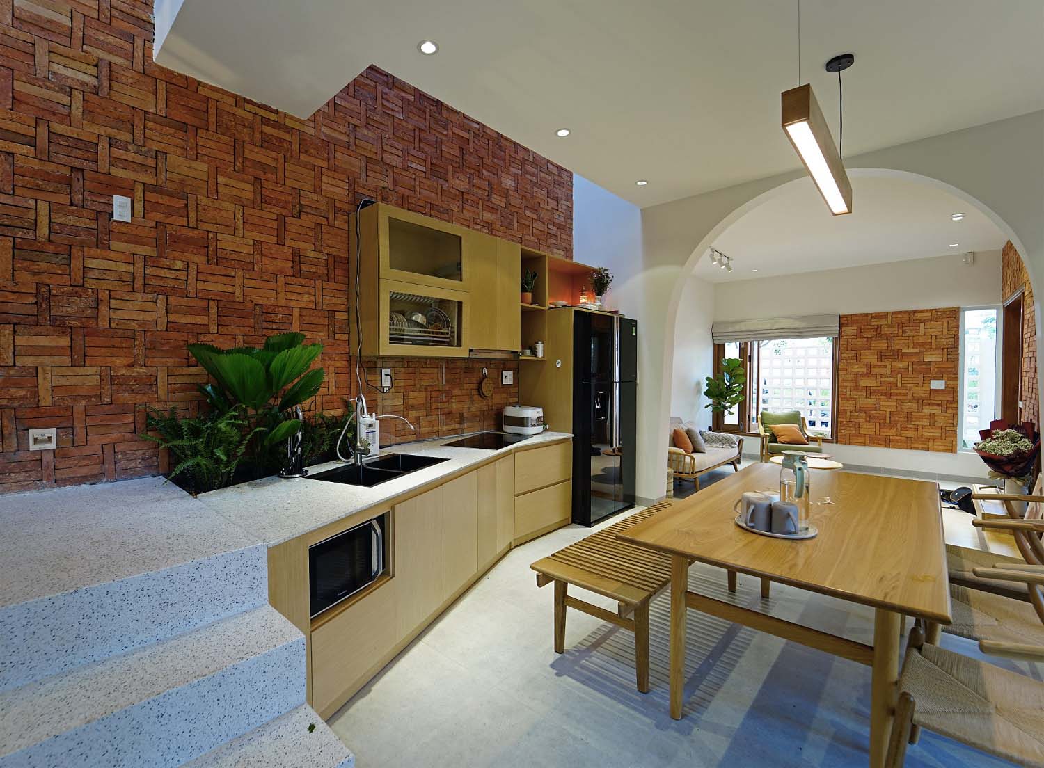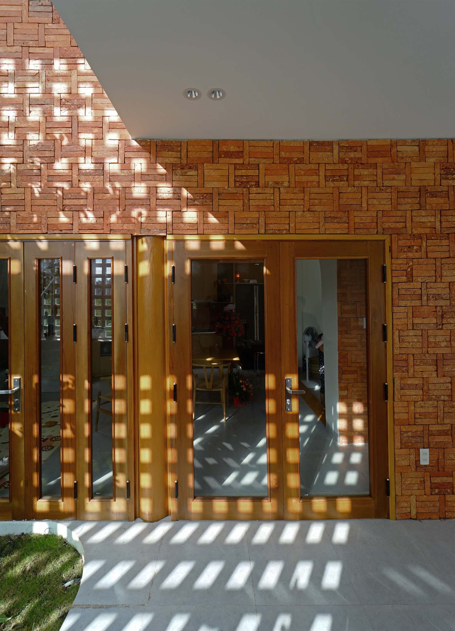 Bên ngoài, mặt tiền căn nhà được thiết kế với những khối nhô ra, lùi vào. Cách làm này không chỉ tạo sự ấn tượng mà còn tránh tạo cảm giác nặng nề cho công trình có chiều ngang 8 mét. Màu sắc chủ đạo của công trình là màu trắng và màu gạch thẻ. Kết hợp với màu xanh của cây cối, gạch nhà tắm và màu trung tính của nội thất, chúng tạo nên không gian sống thô mộc và làm dịu mắt người sử dụng.