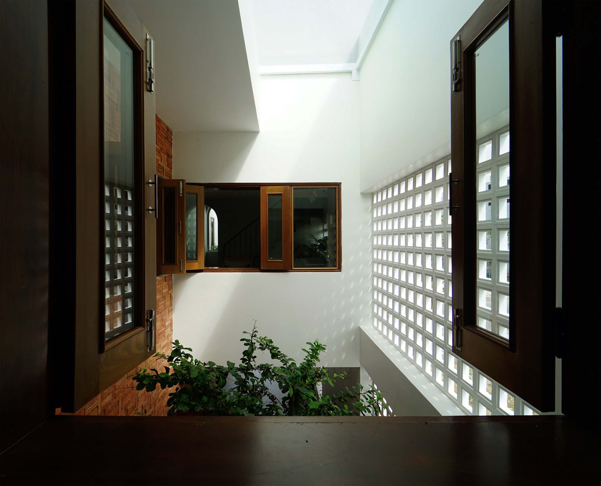 Các khoảng thông tầng nằm rải rác trong nhà với chủ đích lấy sáng cho những chỗ khuất và liên tục điều hòa không khí. Ở các khoảng thông tầng này cũng như phần sân trước nhà, gia chủ cùng nhóm thiết kế cho trồng thêm cây xanh. Có đủ nắng và gió, cây cối phát triển tốt, làm mát công trình vào những ngày oi bức và tạo nên chỗ thư giãn cho các thành viên gia đình. Để tăng thêm độ thông thoáng, hông nhà được bố trí những mảng gạch bông gió. Nhờ vậy, ngay cả khi đóng hết cửa, gia chủ cũng không lo nhà bị bí, thiếu gió.
