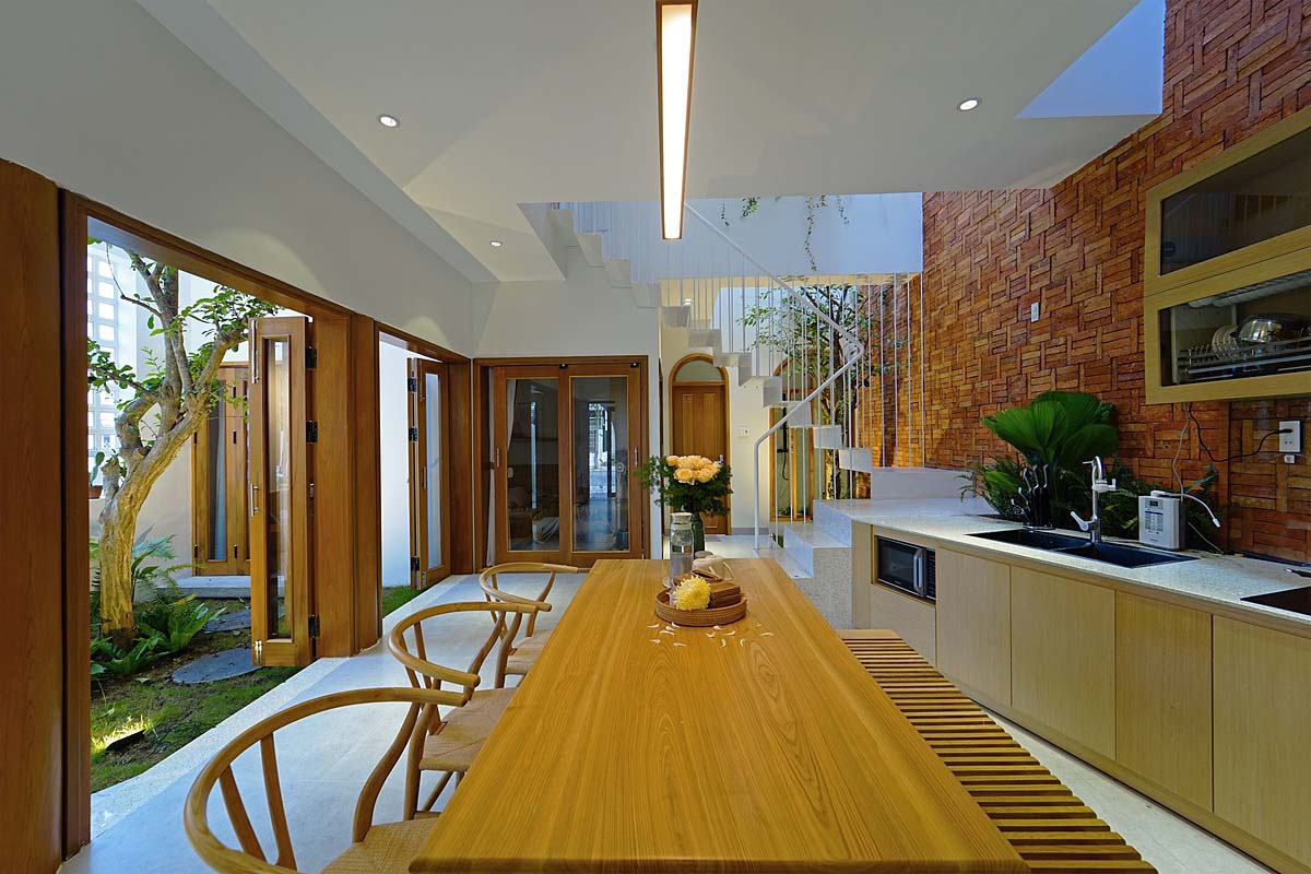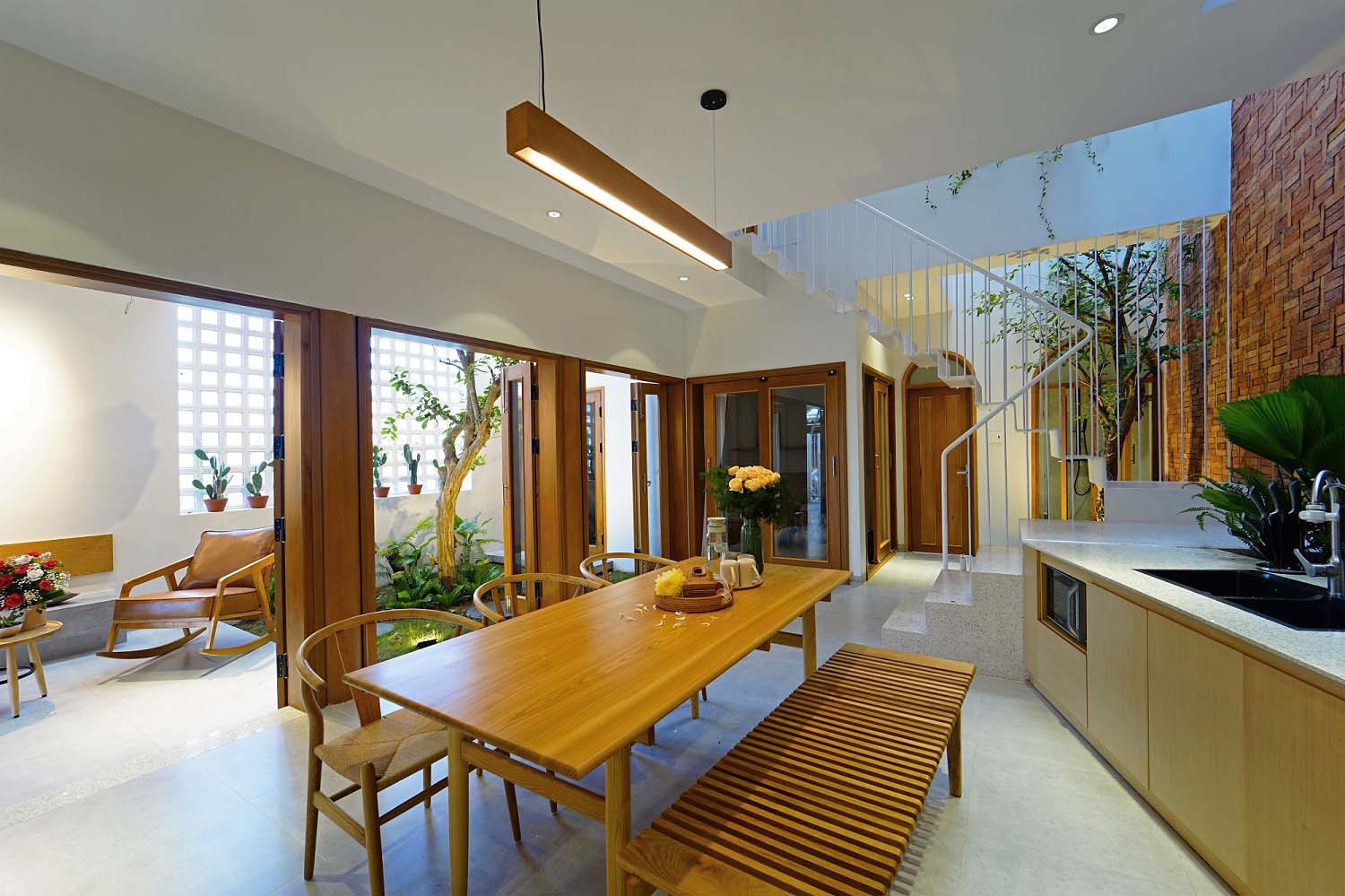 Căn nhà phố nằm trên mảnh đất 128 m2 dành cho cho gia đình bốn người. Để biến công trình thành một không gian mở, tránh ánh nhìn từ bên ngoài của các nhà liền kề nhưng vẫn dễ dàng đón gió và ánh sáng tự nhiên, nhóm thiết kế dành một phần ba diện tích nhà cho các khoảng thông tầng.