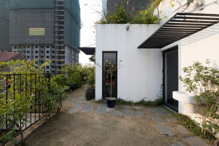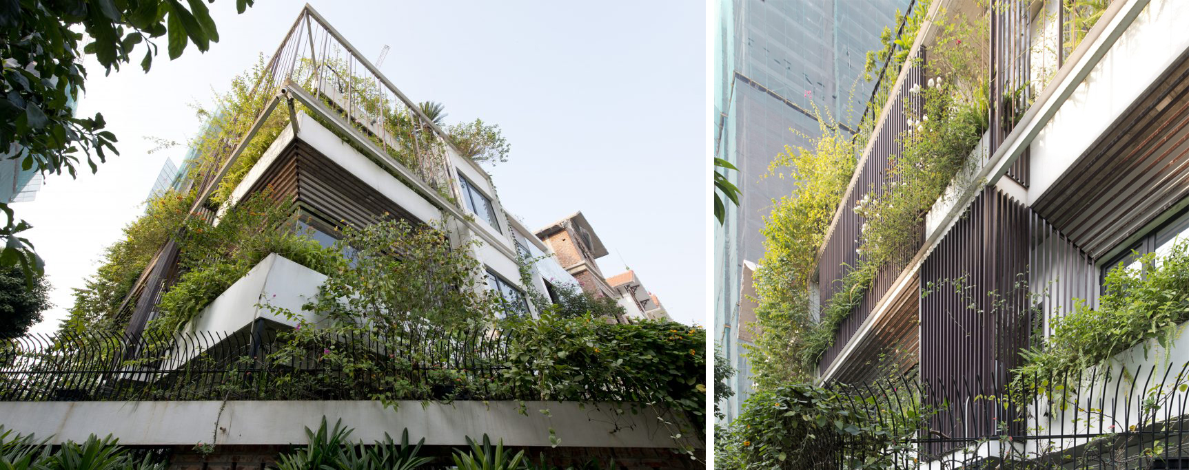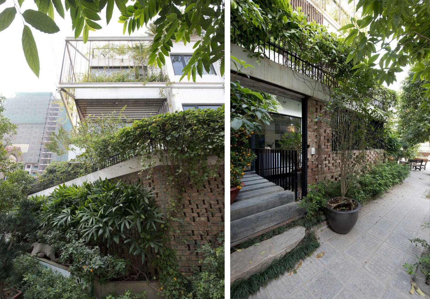Với diện tích vừa phải và có vị trí khá lợi thế, đó là ngã 3 đường nơi hưởng trọn tầm nhìn của cả dự án, tuy nhiên toàn bộ mặt tiền của ngôi nhà lại chịu ảnh hưởng trực tiếp của nắng hướng Tây, vì thế chúng tôi đã xây dựng một hệ lam thép bao bọc lấy công trình và là xương sống cho toàn bộ giàn cây leo có thể phủ xanh mặt tiền.