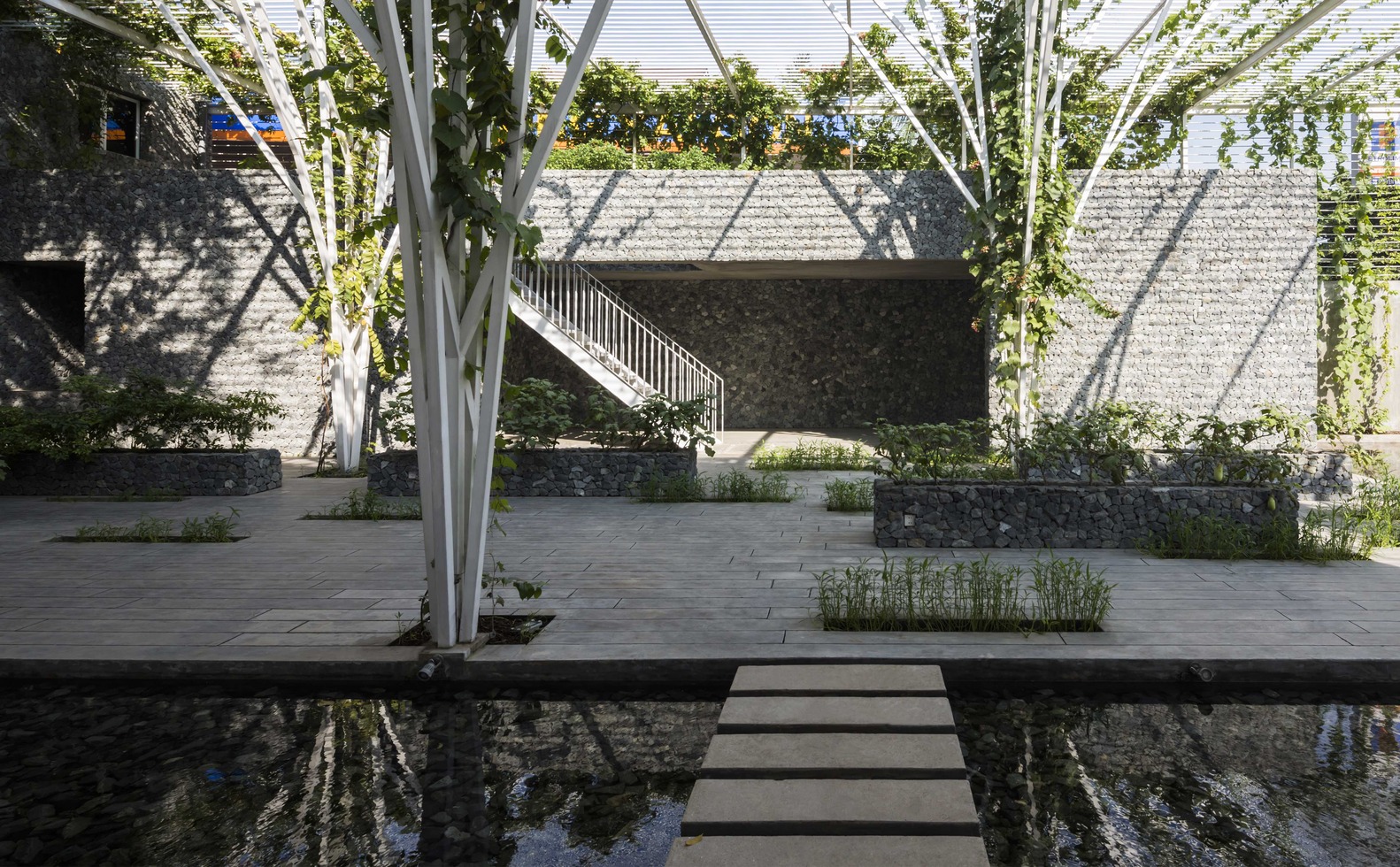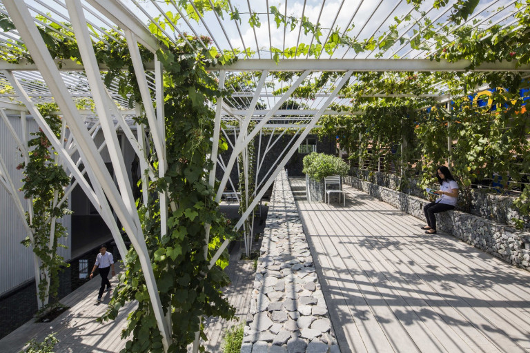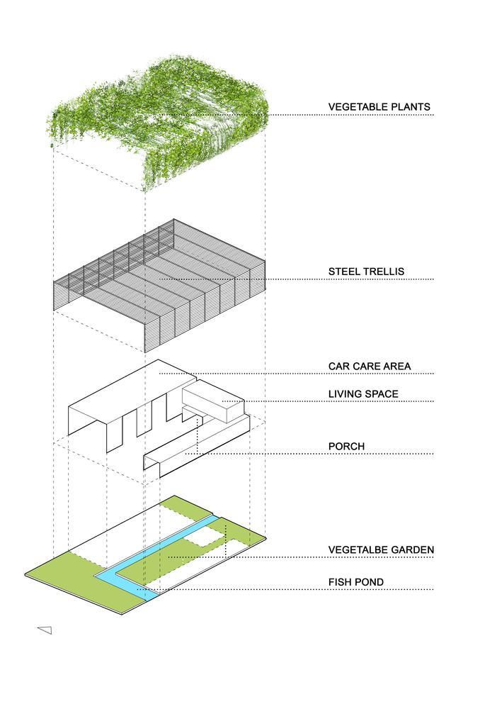 Chia sẻ của KTS thiết kế: “Ý tưởng được đưa ra là tạo ra một giàn thực phẩm bao phủ không gian nghỉ ngơi và sinh hoạt cộng đồng bên dưới. 1 giải pháp đơn giản, dễ thực hiện và dễ nhân rộng nhất, phù hợp với thực trạng kiến trúc của thành phố nhằm khuyến khích mọi người trồng cây lương thực ngay tại nhà mình.”