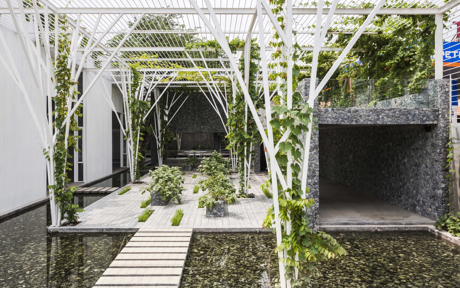 Kiến trúc tầng trệt được mở hoàn toàn tạo nên những không gian sử dụng linh hoạt. Có thể sử dụng đa chức năng như không gian sinh hoạt cộng đồng, nhà hang, triển lãm, hội thảo…