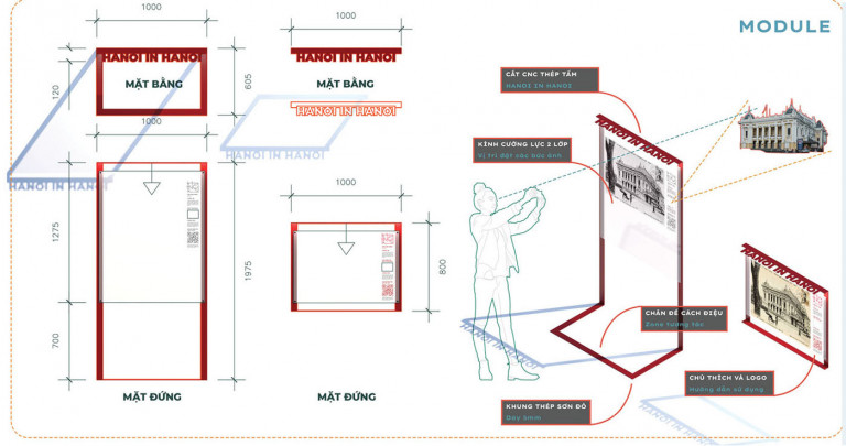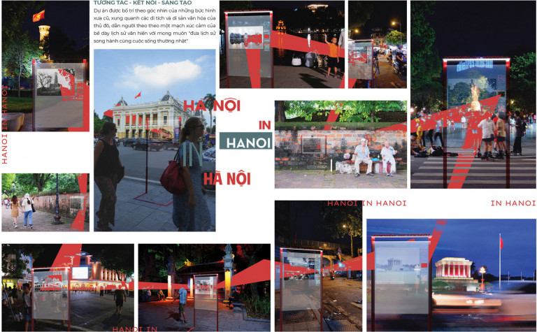 “HANOI in HANOI” là một dự án kiến trúc nhỏ với hi vọng mang được những góc nhìn của thời gian đến gần hơn với mọi người trong hành trình đi tìm lại những giá trị dần bị quên lãng. Phương án đề xuất sử dụng module chứa các thông tin và những tấm ảnh xưa cũ của di tích có khung nhìn tương quan với hình ảnh. Dự án mang đến một kỳ vọng mới về những thiết kế mang lại cảm giác gợi mở, cảm hứng sáng tạo và tác động trực tiếp đến thế giới quan của từng cá nhân.