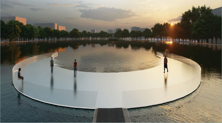 Phương án thiết kế một đài ngắm cảnh giữa Hồ Hoàn Kiếm và sử dụng công nghệ Hologram tạo ra một ảnh đa chiều lơ lửng chiếu lại hình ảnh các công trình nổi tiếng xung quanh Hồ trong suốt một ngày dài. Tác giả muốn tạo ra một trục thời gian hư ảo, mở lối đến chốn phàm trần.