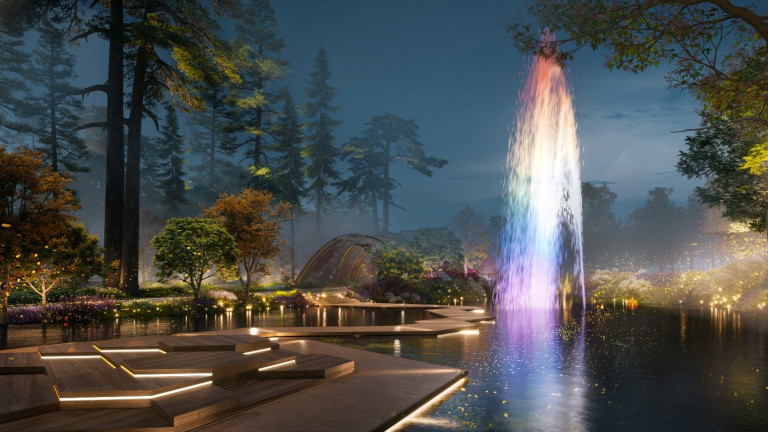 Điểm trên mặt hồ, Isometrix dùng đèn chấm sáng, sợi quang chiếu sát mặt nước tạo cảm giác như ánh sao rơi và cảnh quan ban đêm rực rỡ. “Chúng tôi lập trình hiệu ứng đèn để cây soi bóng xuống mặt hồ với màu sắc chân thực và làm nổi bật khu hồ cảnh quan. Bức tranh ao hoa súng của Claude Monet cũng là khởi nguồn cảm hứng của chúng tôi khi thiết kế chiếu sáng tại đây”, đại diện Isometrix chia sẻ.