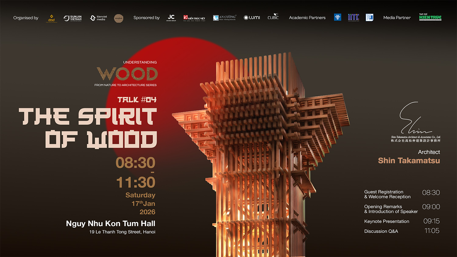 Tại sự kiện, khán giả sẽ được tiếp cận một cách hệ thống và chuyên sâu triết lý ứng dụng gỗ trong việc kiến tạo không gian thiêng của kiến trúc tôn giáo Nhật Bản; những kinh nghiệm triển khai thực tế thông qua phân tích dự án tiêu biểu Nose Myoken-san Worship Hall “SEIREI”. Đồng thời tham gia tọa đàm về khả năng ứng dụng kiến trúc gỗ trong bối cảnh Nhật Bản và Việt Nam, với phần đúc kết chuyên môn và kinh nghiệm nghiên cứu từ TS.KTS Lê Vĩnh An.