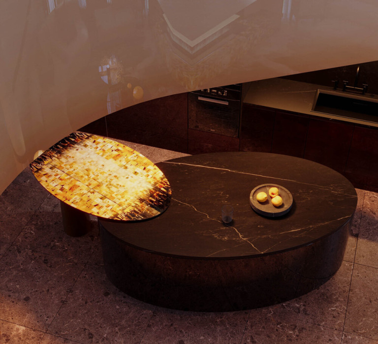 Phần mặt bàn phụ sử dụng cùng ngôn ngữ vật liệu với bàn ăn, tạo nên sự liên kết thị giác xuyên suốt giữa hai khu vực. Khảm sừng tại đây không còn là chi tiết trang trí đơn lẻ, mà đóng vai trò như một “lớp cảm xúc”, mang lại sự ấm áp và chiều sâu cho không gian nấu nướng. Sự tương phản giữa đá đen vân trắng, kim loại mờ và bề mặt khảm sừng ánh kim tạo nên một cấu trúc vật liệu đa tầng, nơi yếu tố hiện đại và truyền thống không đối lập, mà bổ trợ lẫn nhau.