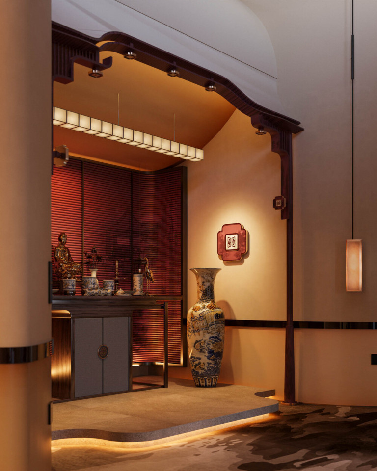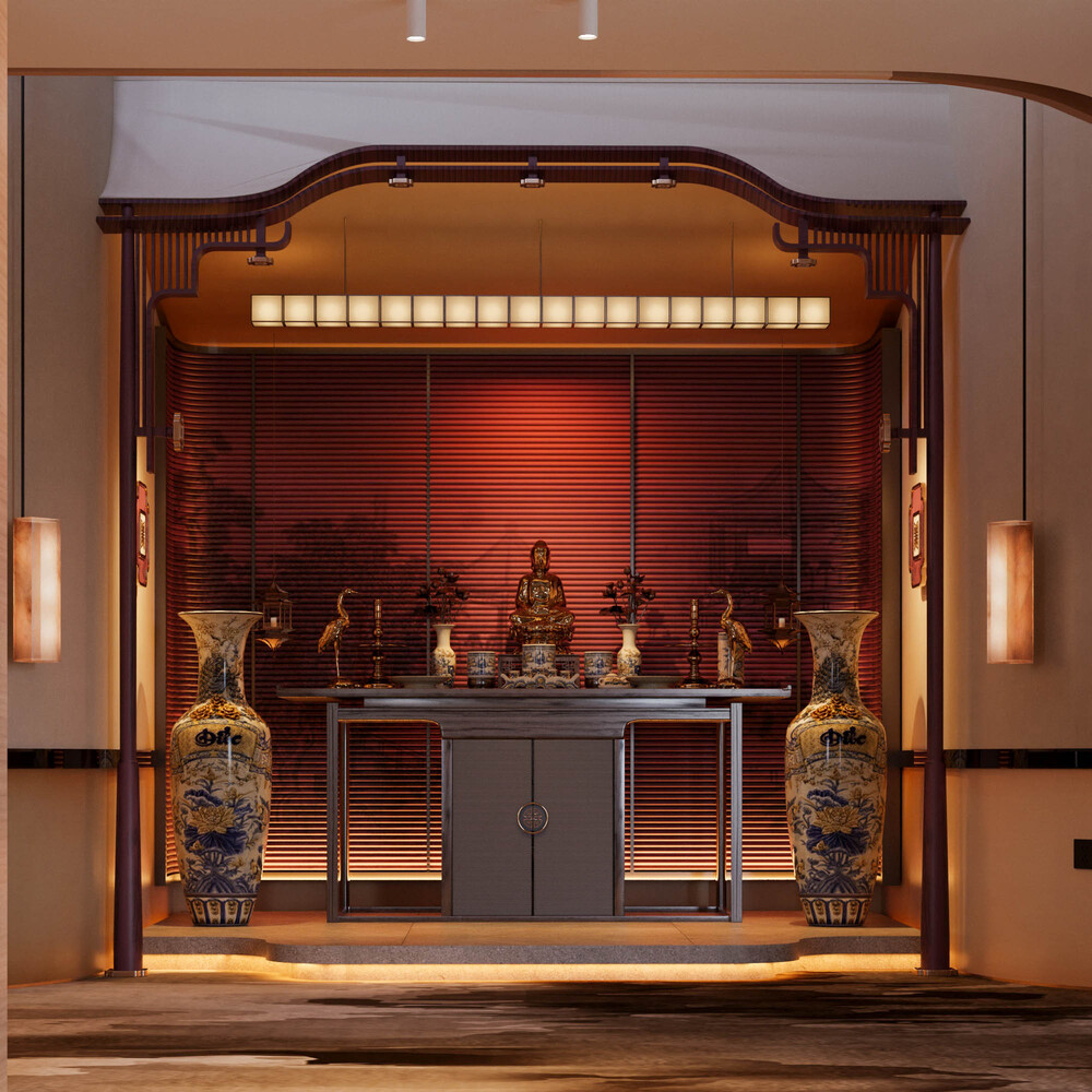 Khu vực thờ tự được đặt trên cao độ nâng nhẹ, bố cục đối xứng chặt chẽ, với nền đỏ trầm, ánh vàng ấm và hệ đèn tuyến tính tạo chiều sâu thị giác. Tượng thờ, đồ gốm và chi tiết kim loại được tiết chế vừa đủ, đặt trong một khung kiến trúc mang dáng dấp truyền thống nhưng xử lý bằng ngôn ngữ đương đại, tạo nên sự cân bằng giữa tâm linh, thẩm mỹ và không gian sống hiện đại.