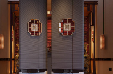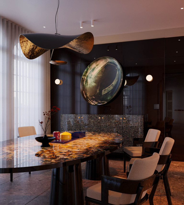 Hệ ghế ăn được tiết chế về màu sắc, sử dụng tông trung tính và khung gỗ sẫm, tạo nền thị giác để bề mặt sơn mài – khảm sừng được tôn vinh một cách trọn vẹn. Phía trên, cụm đèn treo điêu khắc với mặt trong ánh kim tiếp tục nhấn mạnh mối đối thoại giữa ánh sáng – phản chiếu – vật liệu, khiến không gian phòng ăn vượt ra khỏi vai trò chức năng thông thường.
