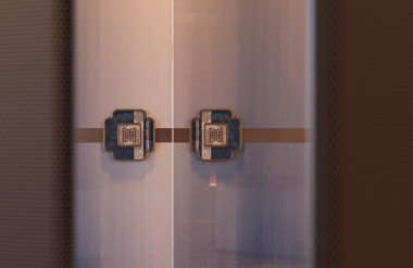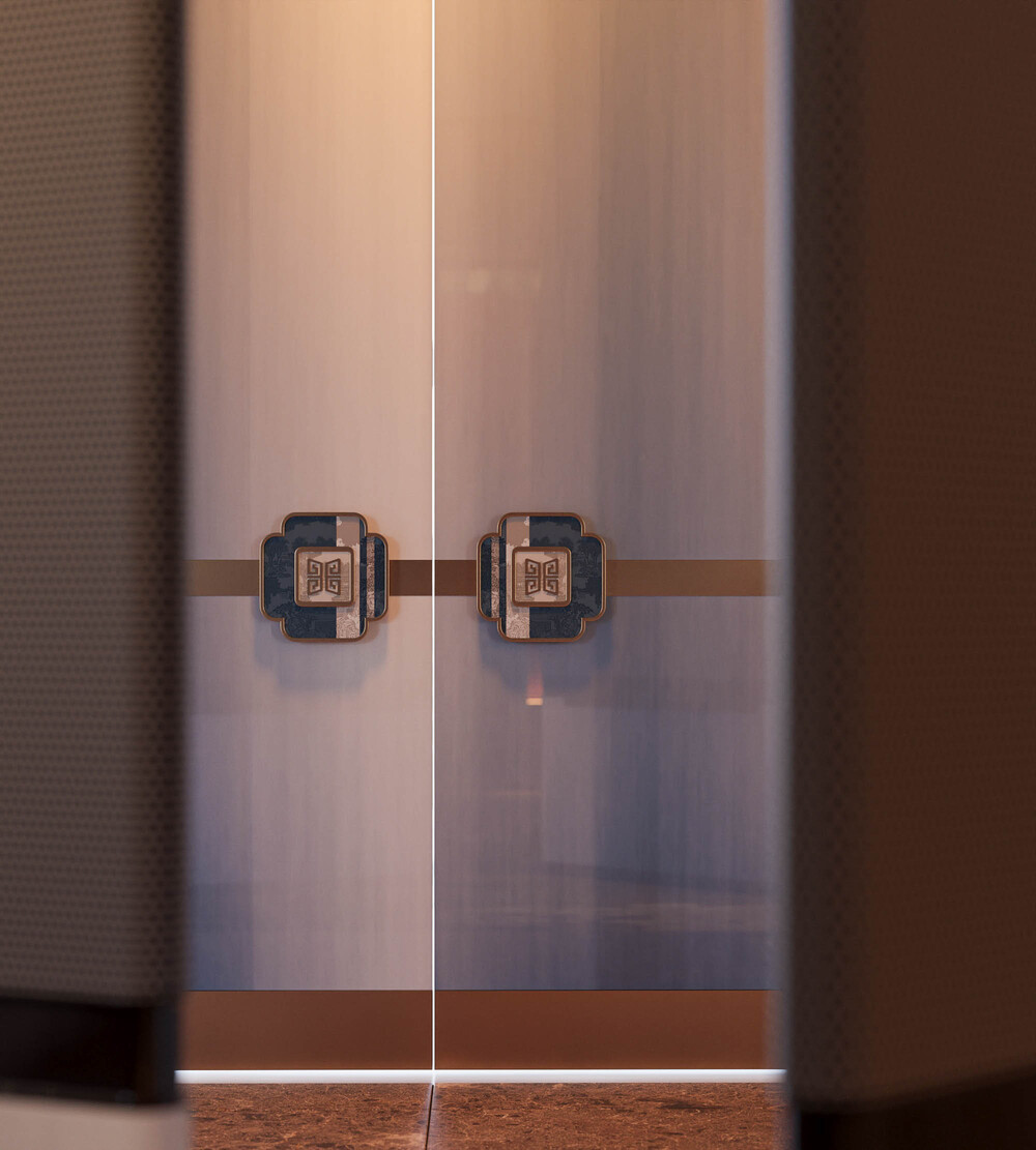 Không gian sảnh và thờ tự được tổ chức như một trục chuyển tiếp giàu tính nghi lễ, nơi ánh sáng, hình khối và vật liệu cùng dẫn dắt cảm xúc về trạng thái tĩnh tại. Hệ cửa sảnh với bề mặt kim loại tạo hình hình học và tay nắm trang trí mang tính biểu tượng mở ra một lớp không gian trang nghiêm phía sau.