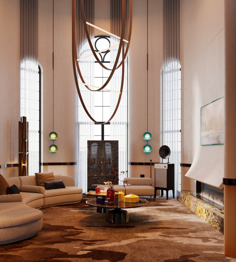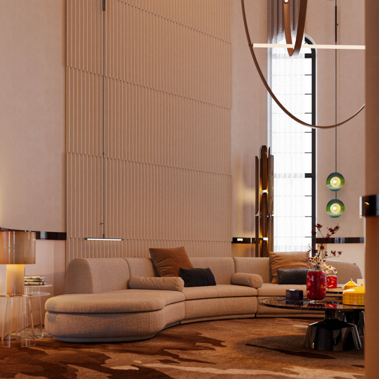 Trên cao, hệ đèn treo điêu khắc với những vòng cong mềm mại định hình nhịp điệu không gian, hoàn thiện một tổng thể nơi nghệ thuật thủ công truyền thống được chuyển hóa trọn vẹn trong bối cảnh sống đương đại.