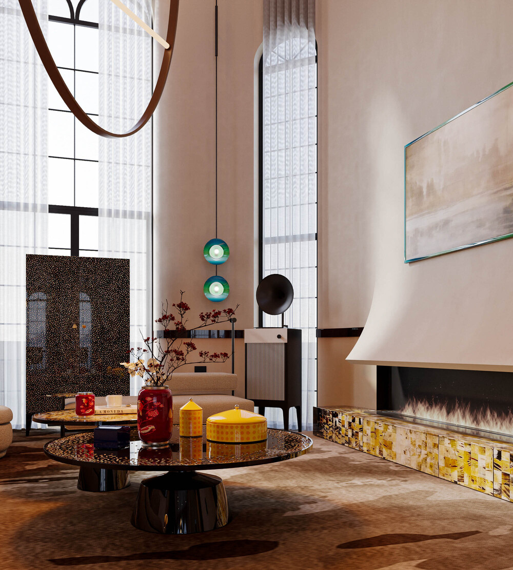Hệ sofa bo cong, thảm hữu cơ và bảng màu trung tính đóng vai trò cân bằng thị giác, nhường sân khấu cho vật liệu thủ công lên tiếng. Mảng lò sưởi khảm sừng kéo dài theo phương ngang tạo điểm nhấn ấm áp, đối lập tinh tế với phần chụp lò tối giản phía trên.