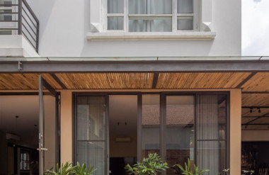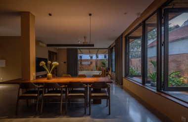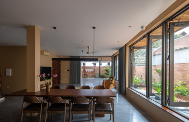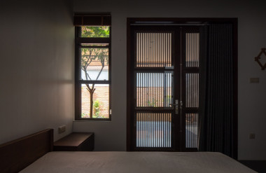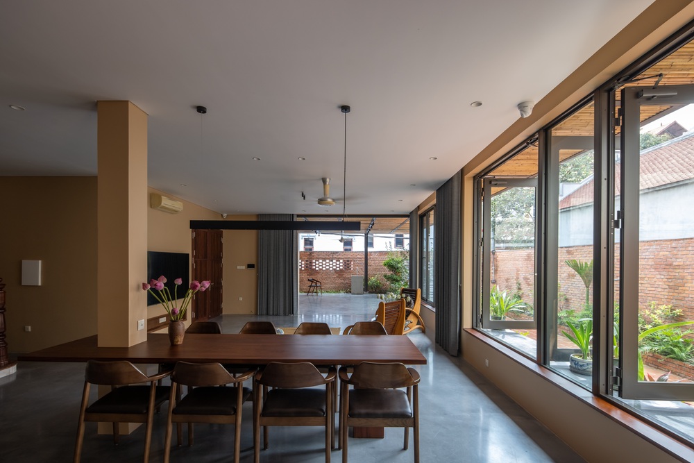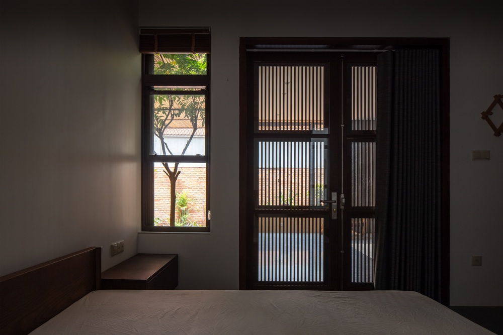 Mặt tiền được “giải phóng” bằng cách tháo bỏ các bức tường kín, thay thế bằng hệ khung cửa cũ – từng được sử dụng trong một ngôi nhà khác của gia đình tại nội thành xây dựng năm 2010.