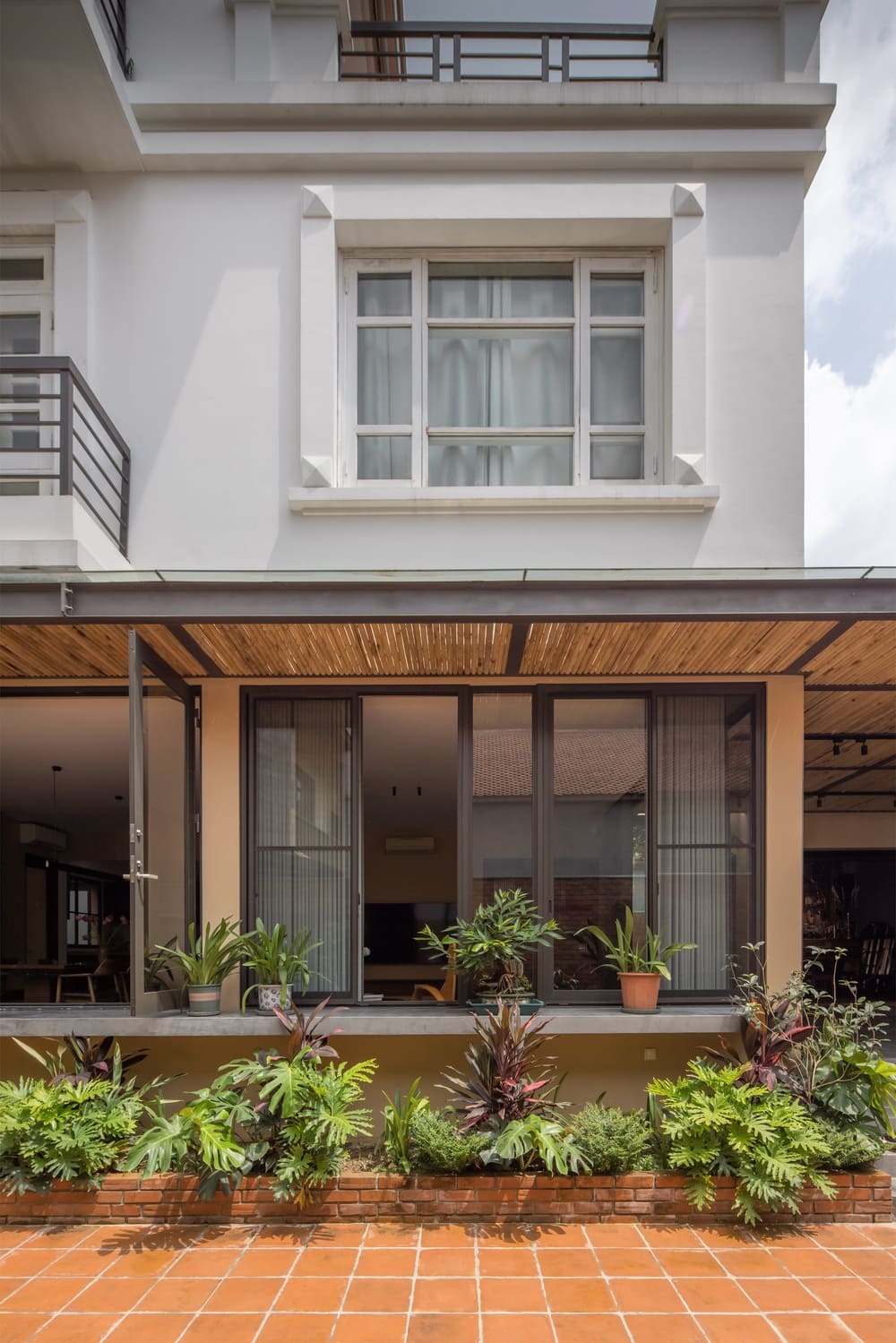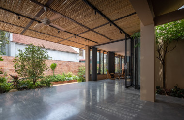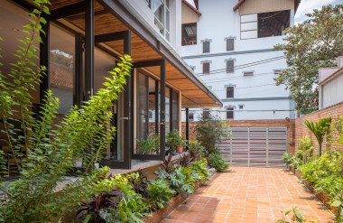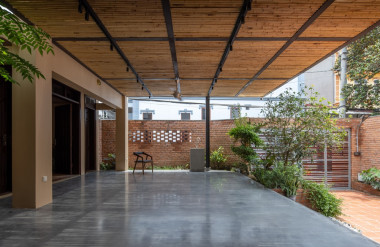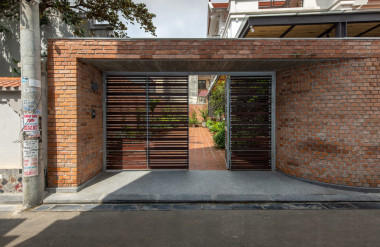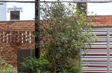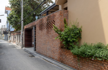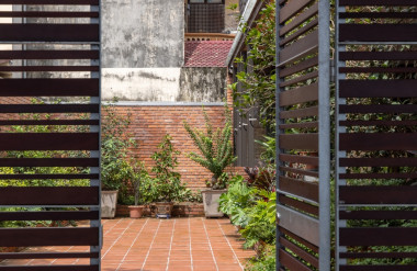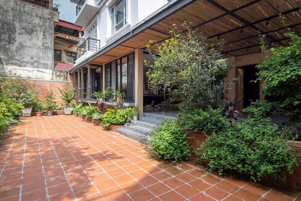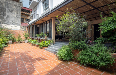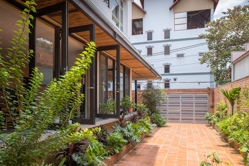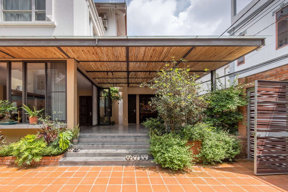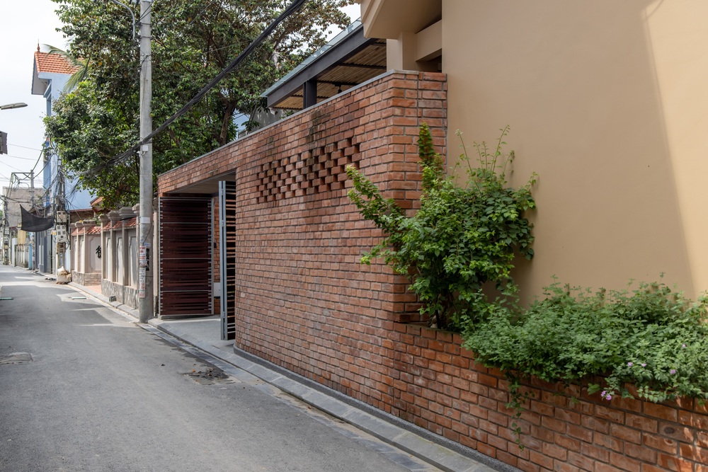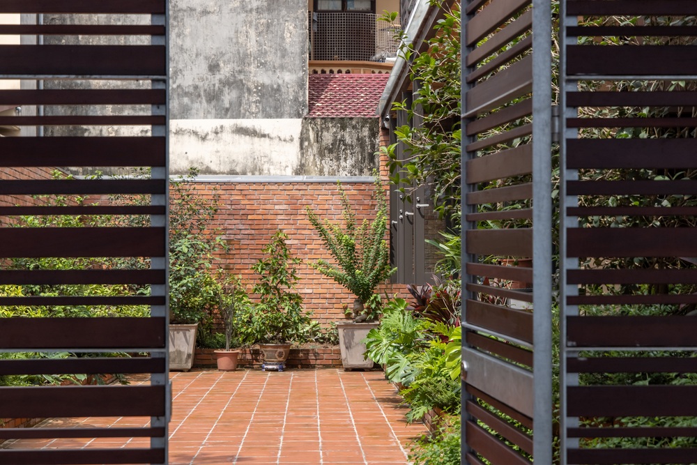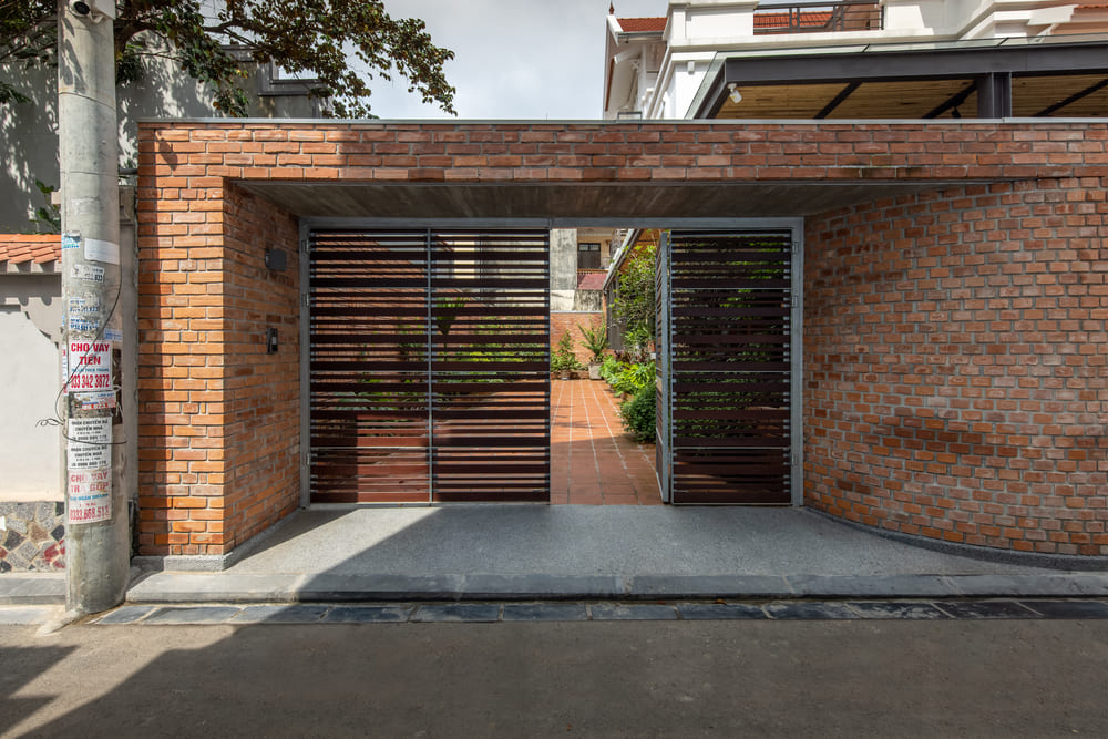 Cổng gỗ, tường rào và sân bằng gạch đỏ kết hợp với cây xanh được sắp sếp lại từ khu vườn cũ bao bọc lấy sân và nhà chính đảm bảo sự riêng tư đồng thời tái hiện bầu không khí của quê hương.
