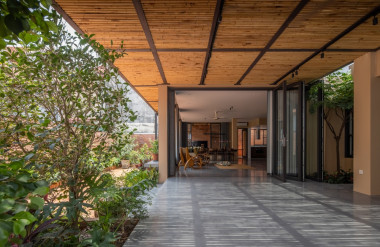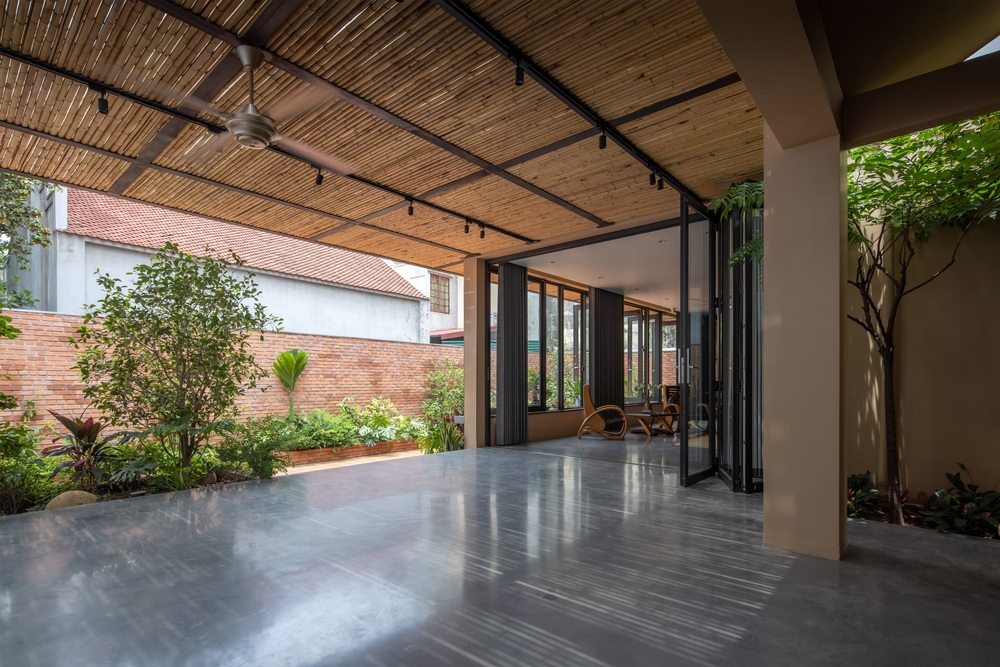 Thiết kế mái hiên lớn chạy dọc sân trước tạo sự liên kết xuyên suốt từ khu nhà thờ tới không gian sinh hoạt, xóa mờ ranh giới giữa trong và ngoài, đồng thời tiếp nối ký ức sống của gia đình.