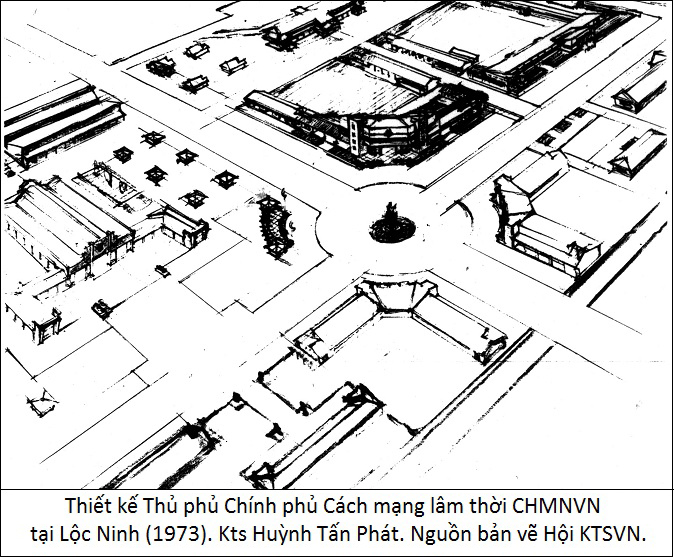 Thủ phủ Chính phủ Cách mạng lâm thời Cộng hòa miền Nam Việt Nam tại Thị xã Lộc Ninh, tỉnh Bình Phước, 1972 – 1973. Sát ngày Hiệp định Paris về Việt Nam, theo chỉ đạo của Trung ương, Chính phủ cách mạng lâm thời CH miền Nam Việt Nam chọn thị xã Lộc Ninh, tỉnh Bình Phước làm thủ phủ, đích thân Chủ tịch chính phủ Huỳnh Tấn Phát khẩn trương thiết kế từ tổng thể đến chi tiết kiến trúc, quy hoạch. Ông đã vẽ 60 bản khổ lớn; từ mặt bằng quy hoạch chung, đường xá đến các nhiệm sở chính quyền, nhà công cộng, một số khu ở… Trước ngày thiết kế thủ phủ Lộc Ninh, KTS Huỳnh Tấn Phát đã thiết kế hầu hết các ngôi nhà làm việc, nhà ở lớn nhỏ của cơ quan Trung ương Cục, Bộ tư lệnh miền, hội trường lớn của Mặt trận dân tộc giải phóng và chính phủ lâm thời CHMNVN. Nét vẽ của ông giản dị, chỉ đủ mức vật chất tối thiểu trong hoàn cảnh chiến tranh nhưng rất đậm sử thi và niềm tin Thống nhất đất nước không lay chuyển. Vật liệu ngày ấy chỉ có gỗ rừng, tranh tre lá nứa nhưng nhà cửa lợp lá trung quân do ông thiết kế vẫn khang trang và đẹp trong niềm mến phục của cán bộ chiến sĩ cơ quan Mặt trận Dân tộc giải phóng miền Nam Việt Nam và công binh Bộ tư lệnh Miền. Những phác thảo kiến trúc đô thị của KTS Huỳnh Tấn Phát trong chiến tranh ác liệt đã thể hiện tầm nhìn lạc quan, tin tưởng vào thắng lợi của một nhà lãnh đạo, khả năng sáng tạo dồi dào của một Nhà kiến trúc tài năng, một Nhà Văn hóa lớn của Cách mạng. Đây là bút tích kiến trúc Cách mạng còn lại của KTS Huỳnh Tấn Phát, cho thấy ý tưởng lớn lao của ông về xây dựng một thủ phủ của chính quyền cách mạng.